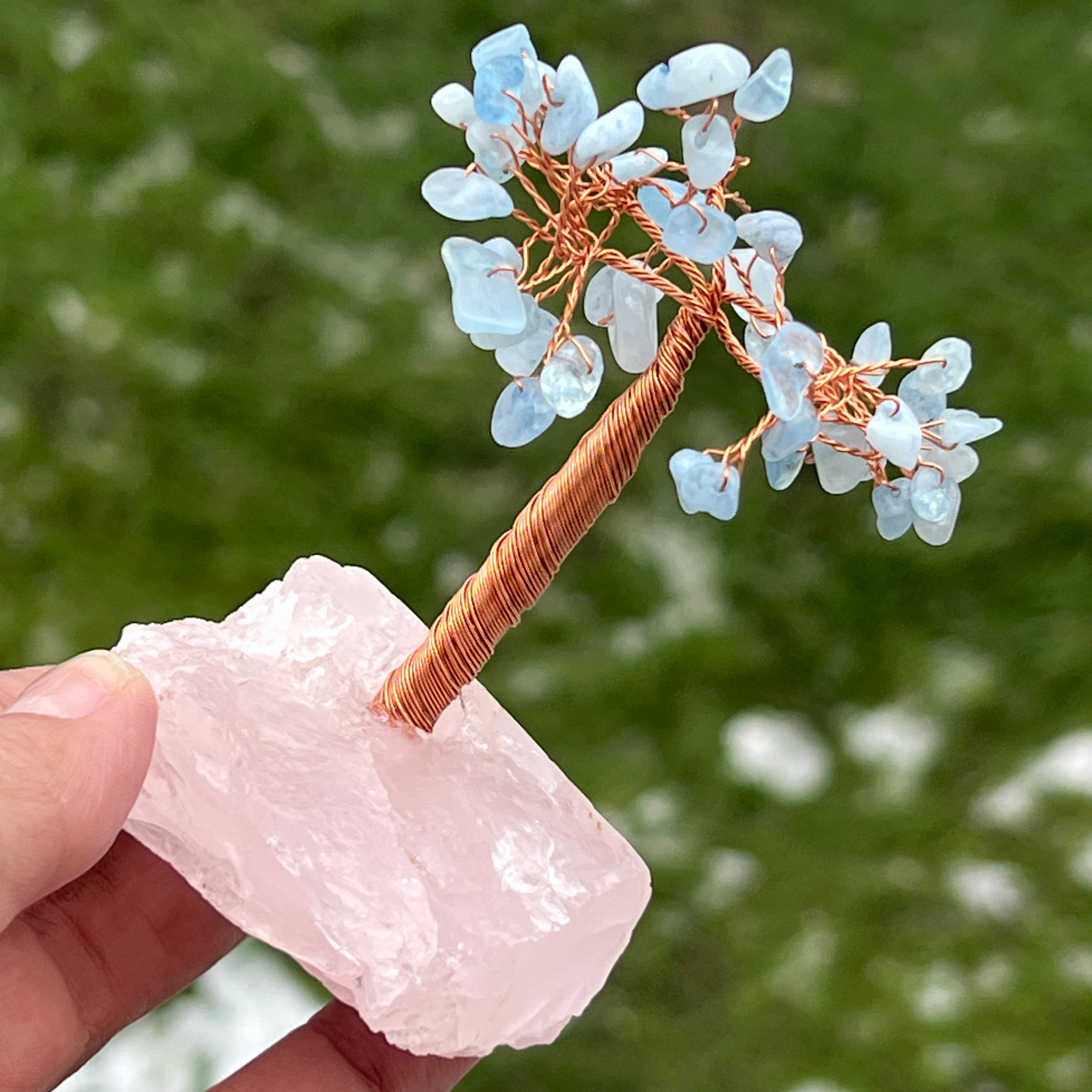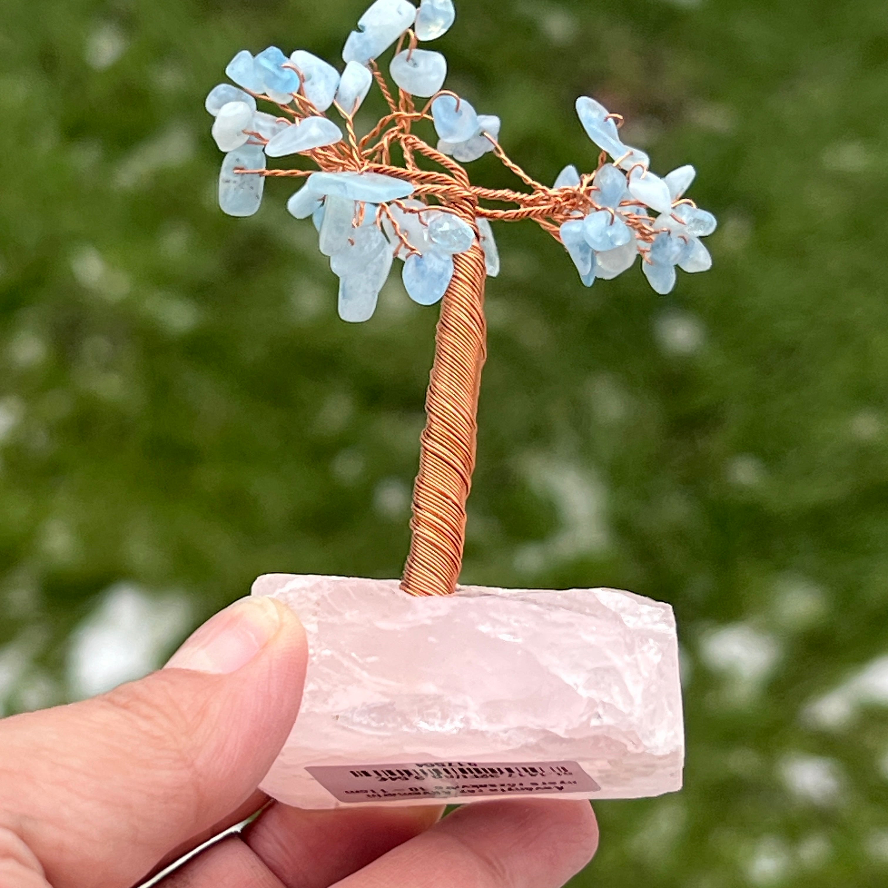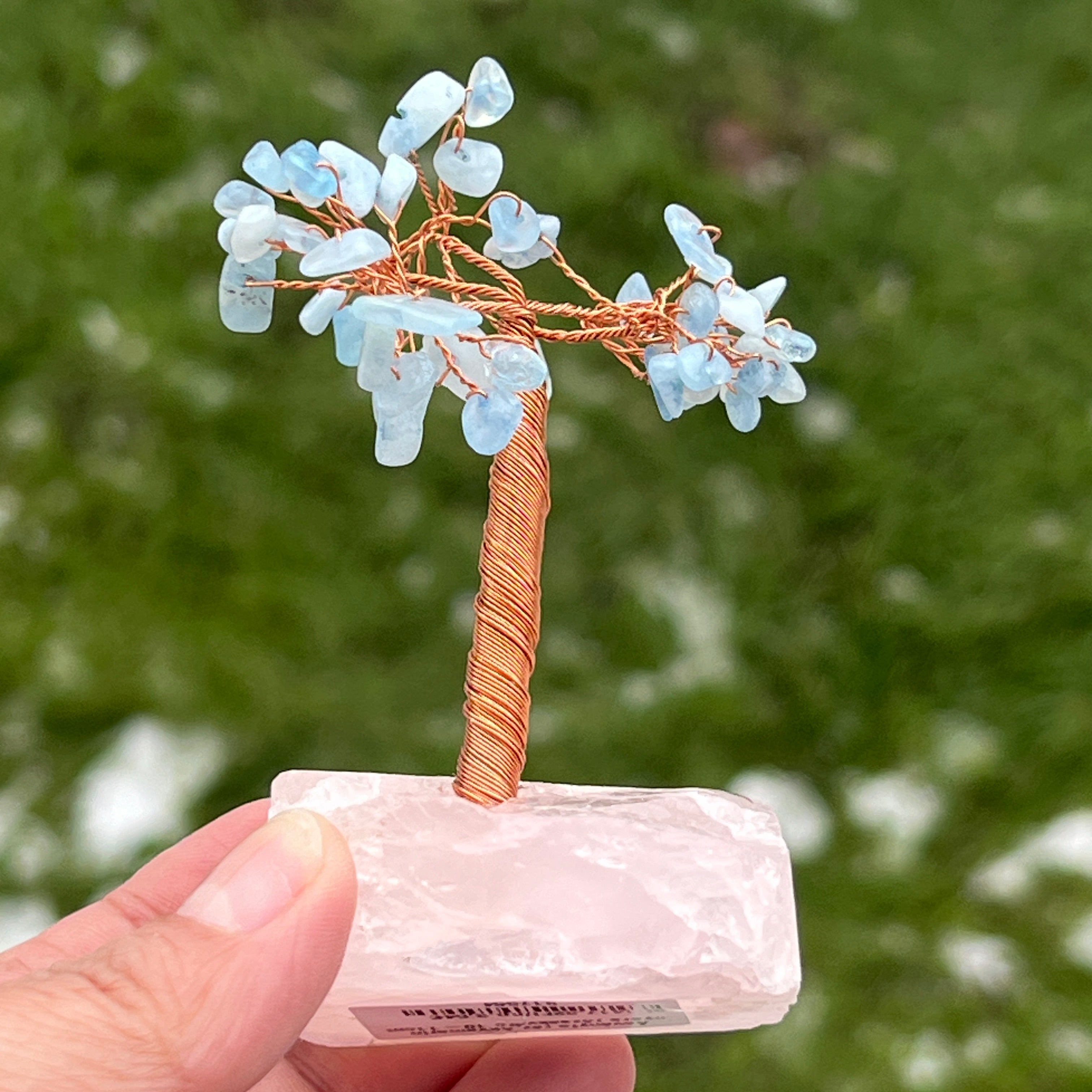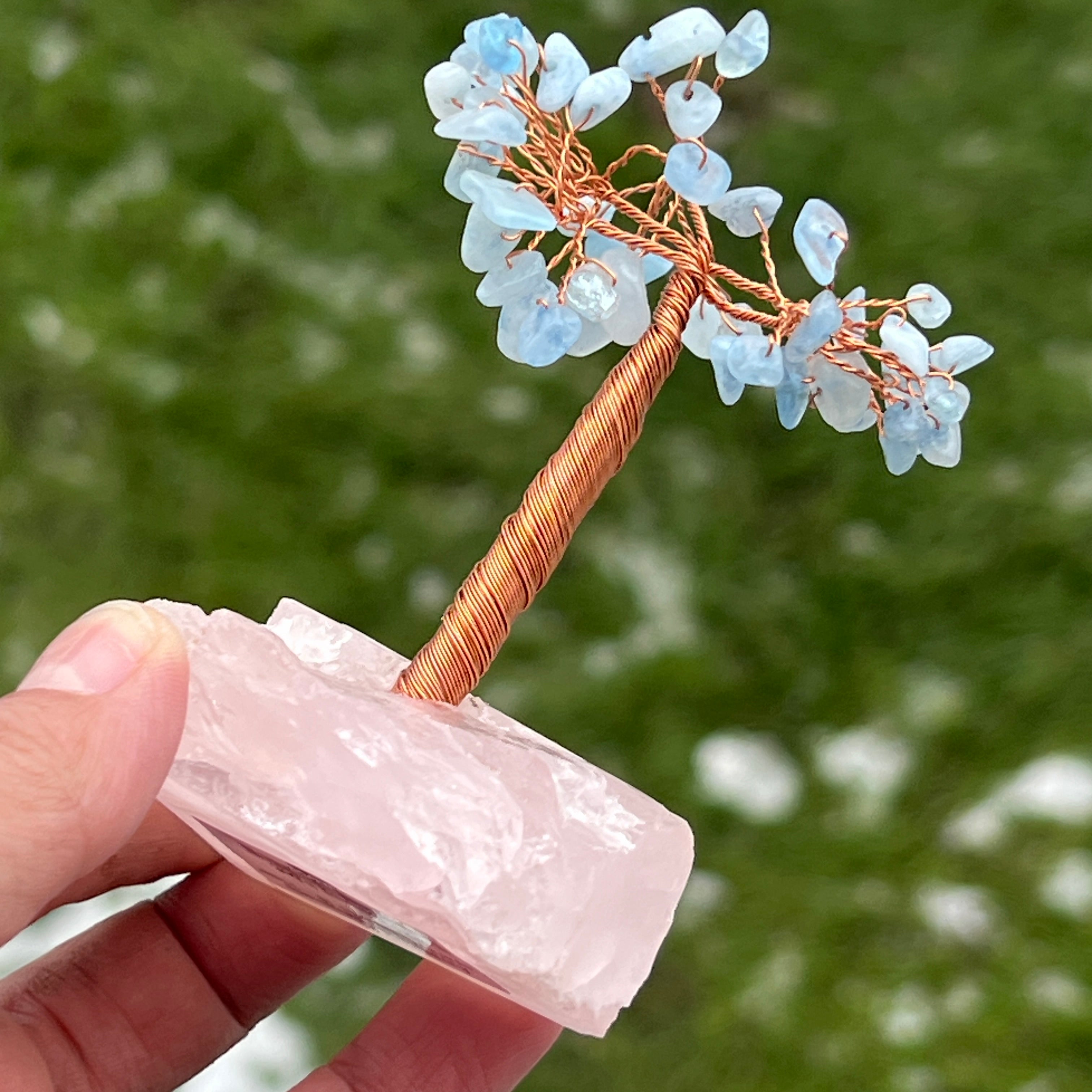 Albero feng shui con acquamarina su base di quarzo rosa – taglia S