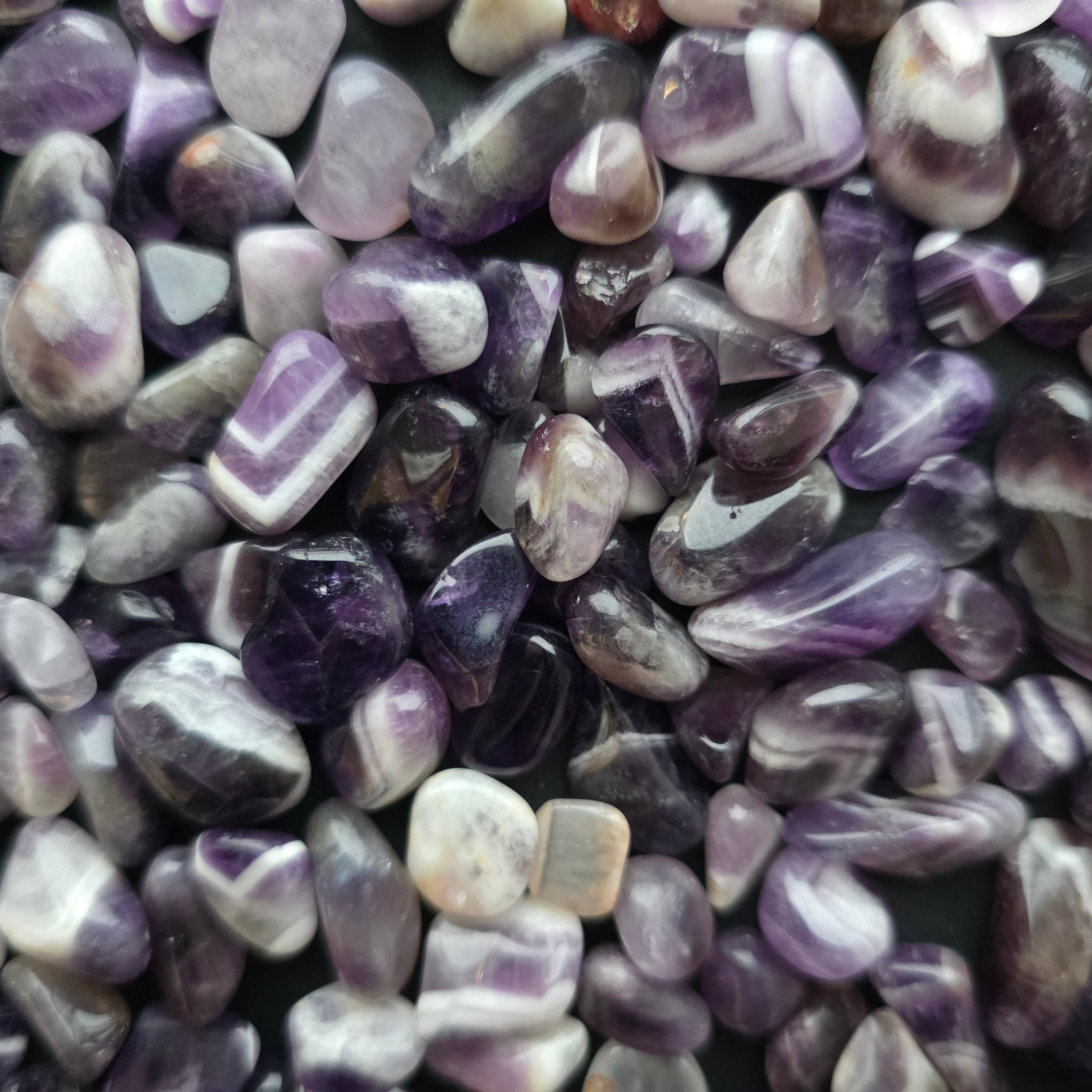 L'ametista Chevron dello Zambia è considerata una delle forme di ametista più spettacolari, grazie alla sua combinazione naturale di viola intenso e bianco latte disposto in bande o motivi a forma di “V”. In questa variante di chips, le pietre piccole e irregolari conservano tutta l'energia del cristallo grezzo, ma in una forma facile da usare per progetti creativi, rituali energetici o decorazioni.