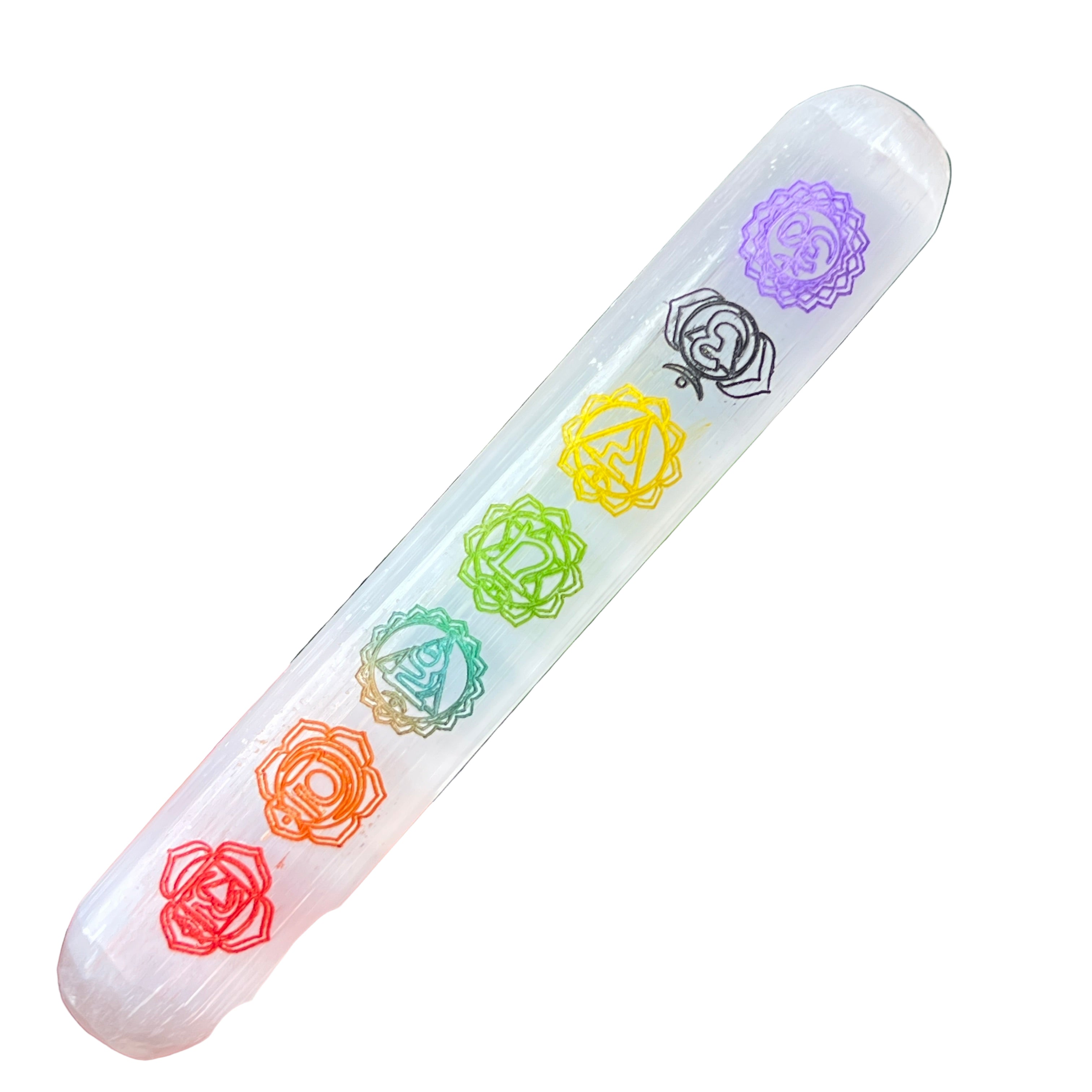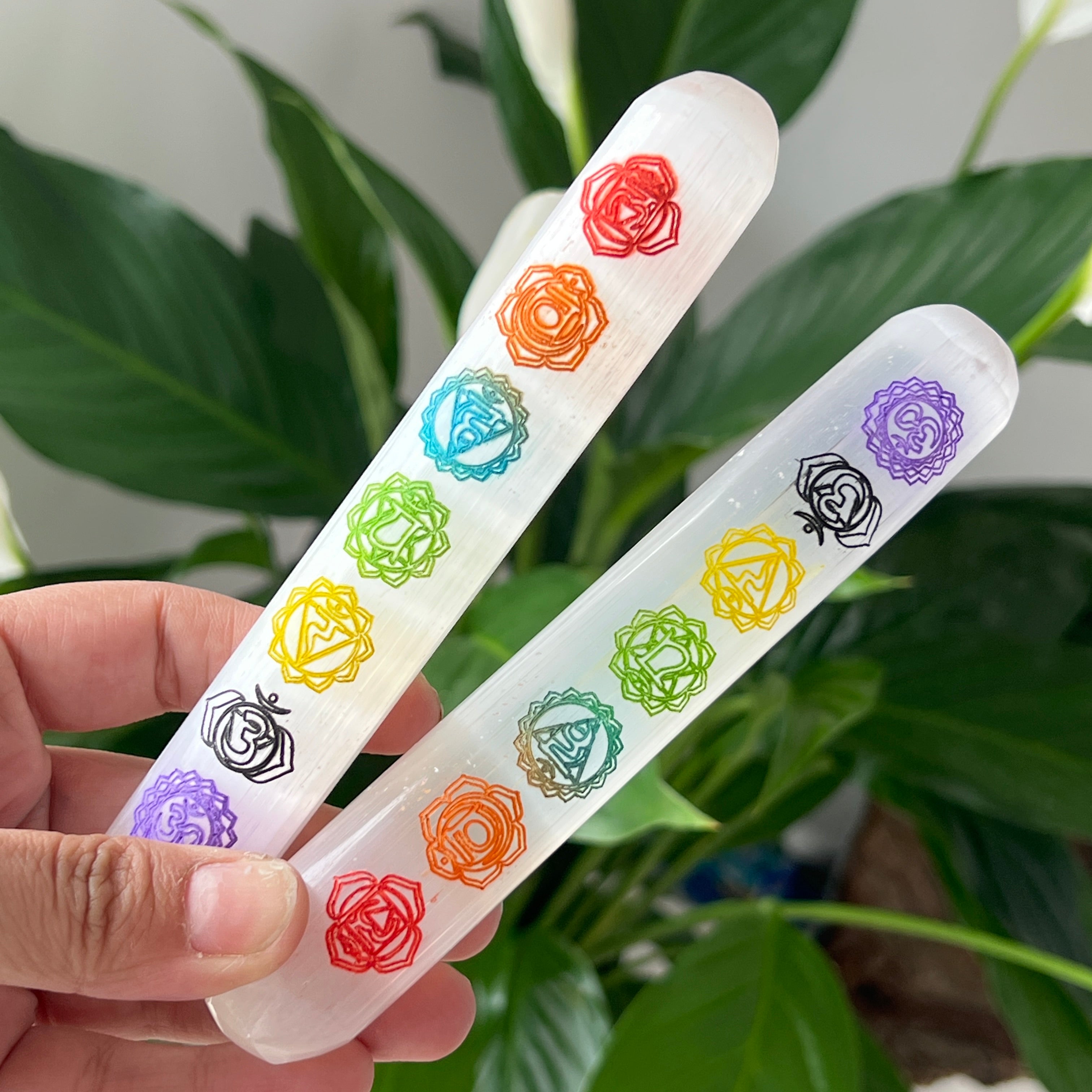 Questa bacchetta da massaggio in selenite è decorata con i simboli dei 7 chakra, ciascuno inciso e colorato distintamente, per sostenere il lavoro energetico e l'equilibrio interiore. La selenite è conosciuta come pietra della luce e della purificazione, utilizzata sia per la chiarezza mentale, sia per la pulizia di altri cristalli e dello spazio personale.