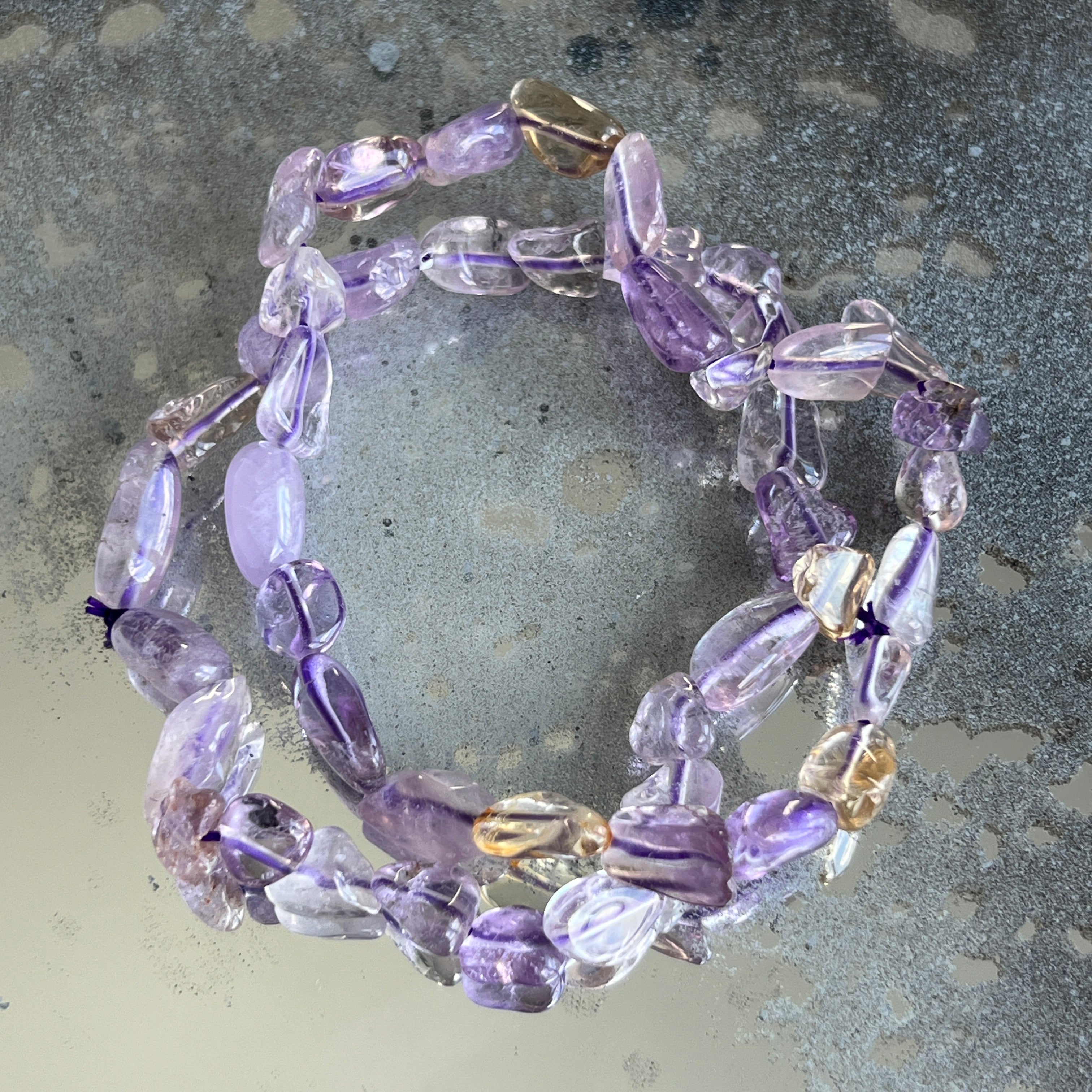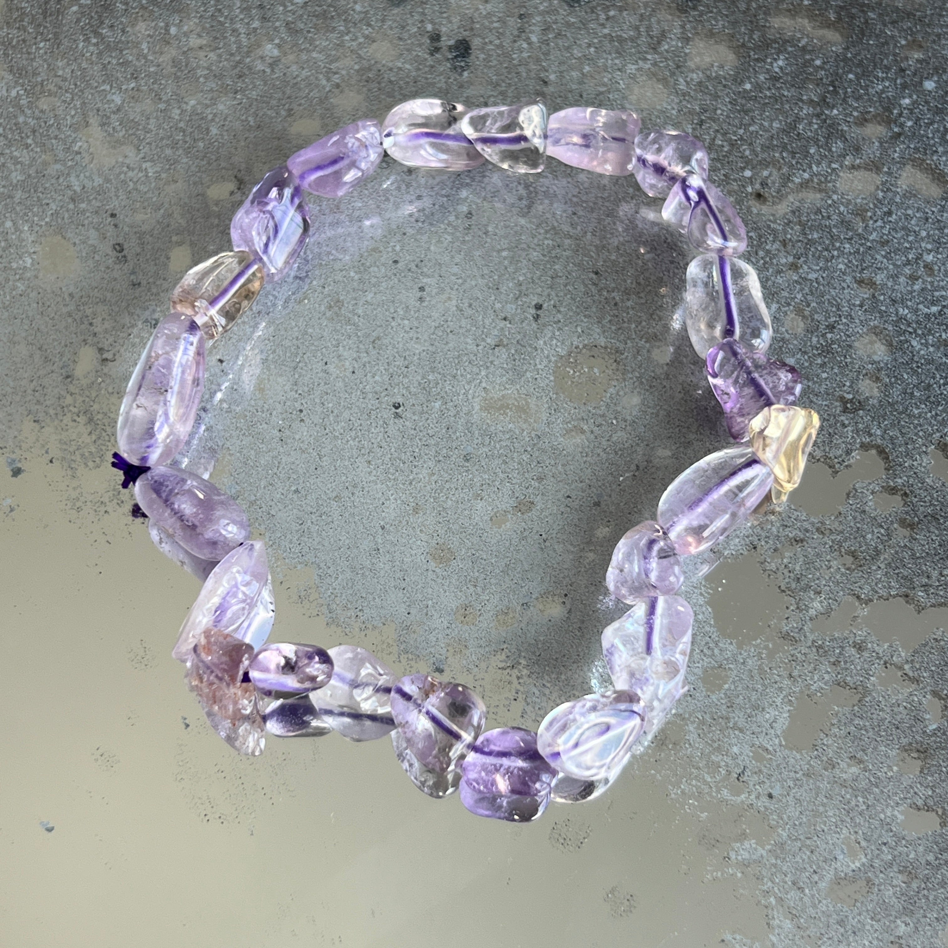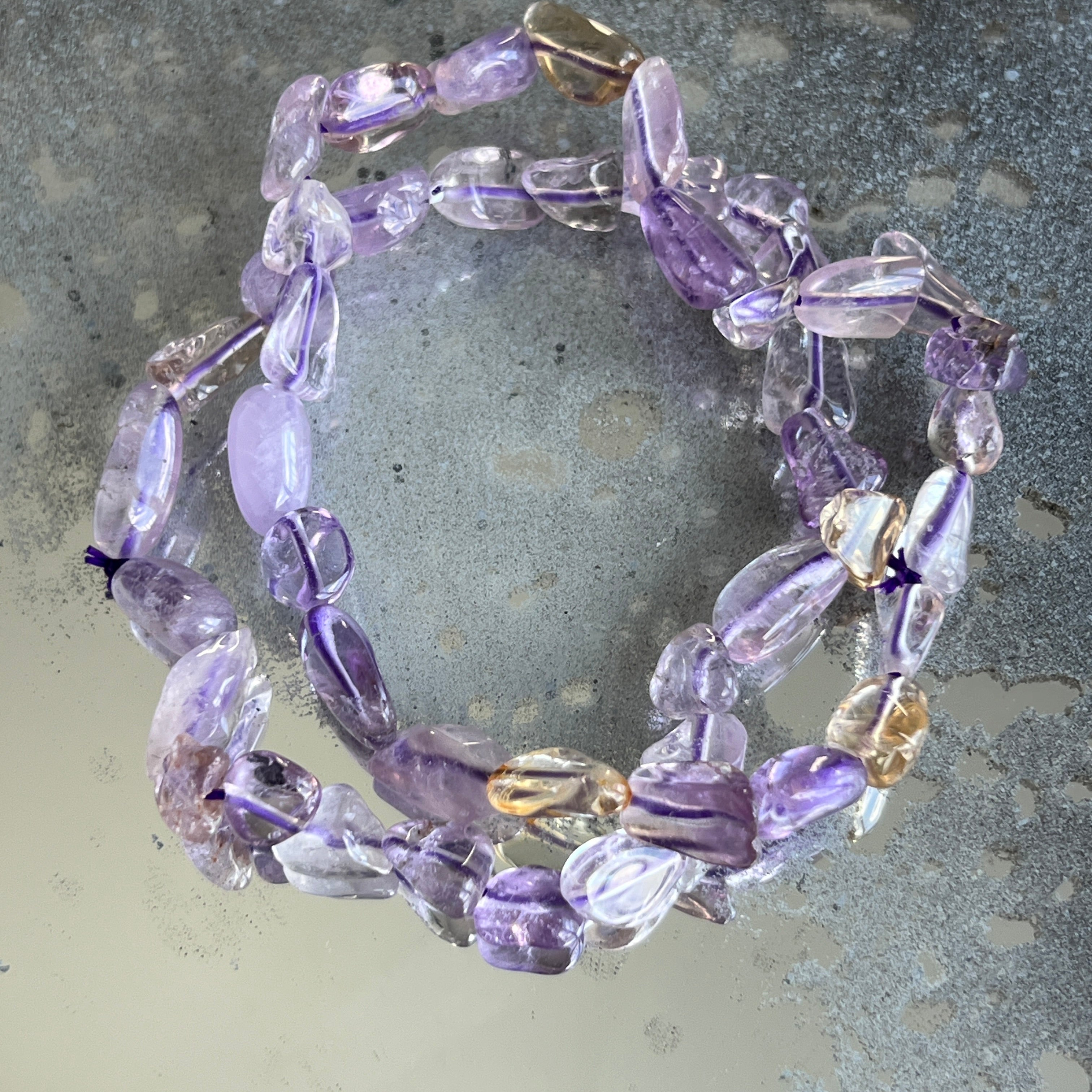 L'ametrine è una delle pietre naturali più affascinanti, intrecciando in un solo cristallo due energie e due colori: il viola profondo dell'ametista e la luce dorata del citrino. In questo bracciale, ogni pietra tumble conserva tracce delle trasformazioni geologiche che hanno creato questa rara combinazione – una fusione perfetta tra calma e chiarezza, tra intuizione e vitalità.