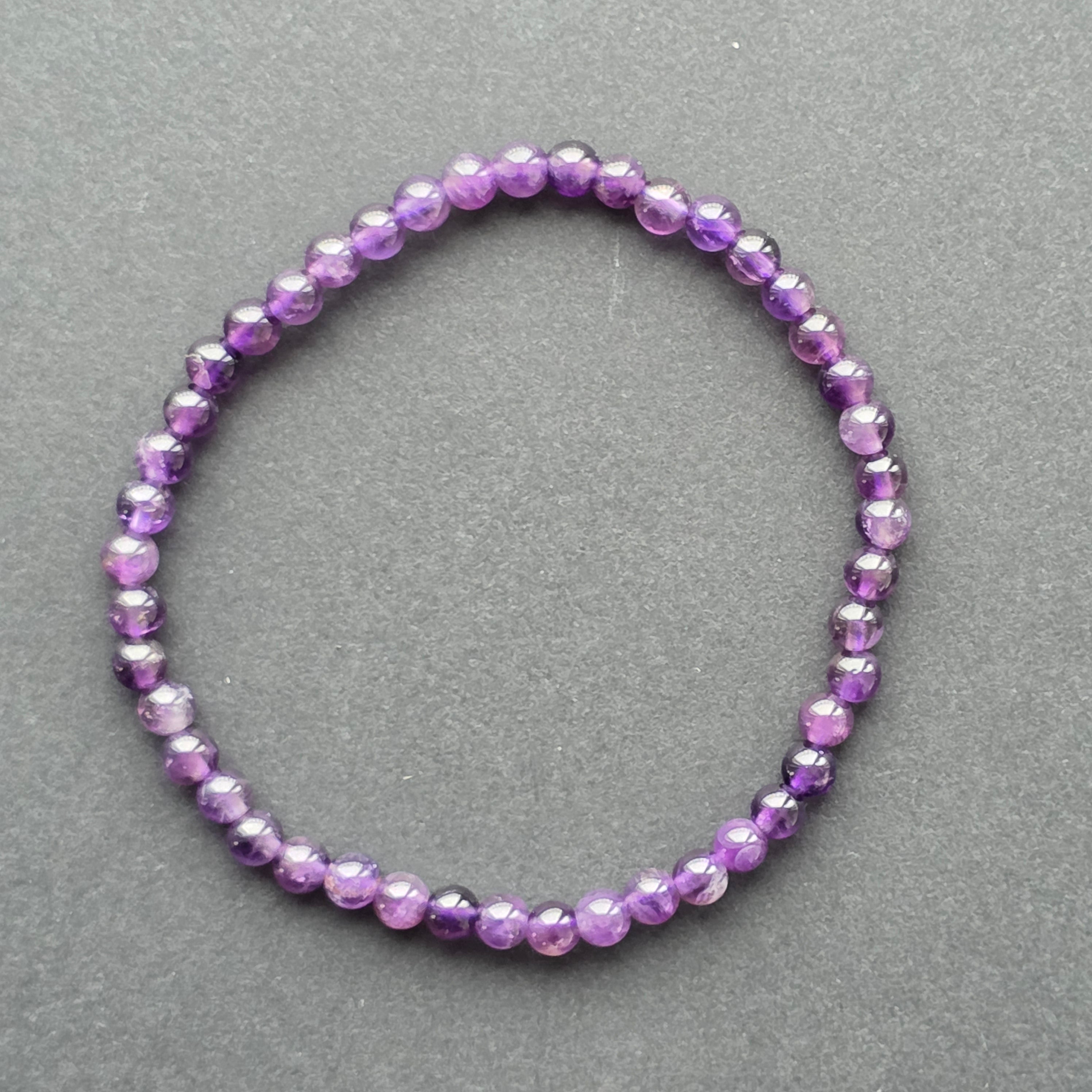 Brățara din ametist aduce la încheietură rafinamentul clasic al uneia dintre cele mai iubite pietre semiprețioase. Mărgelele mici și perfect rotunjite creează un șir delicat de nuanțe mov, într-un gradient natural care amintește de cerul serii sau de intensitatea unei flori de lavandă atinse de lumină.
