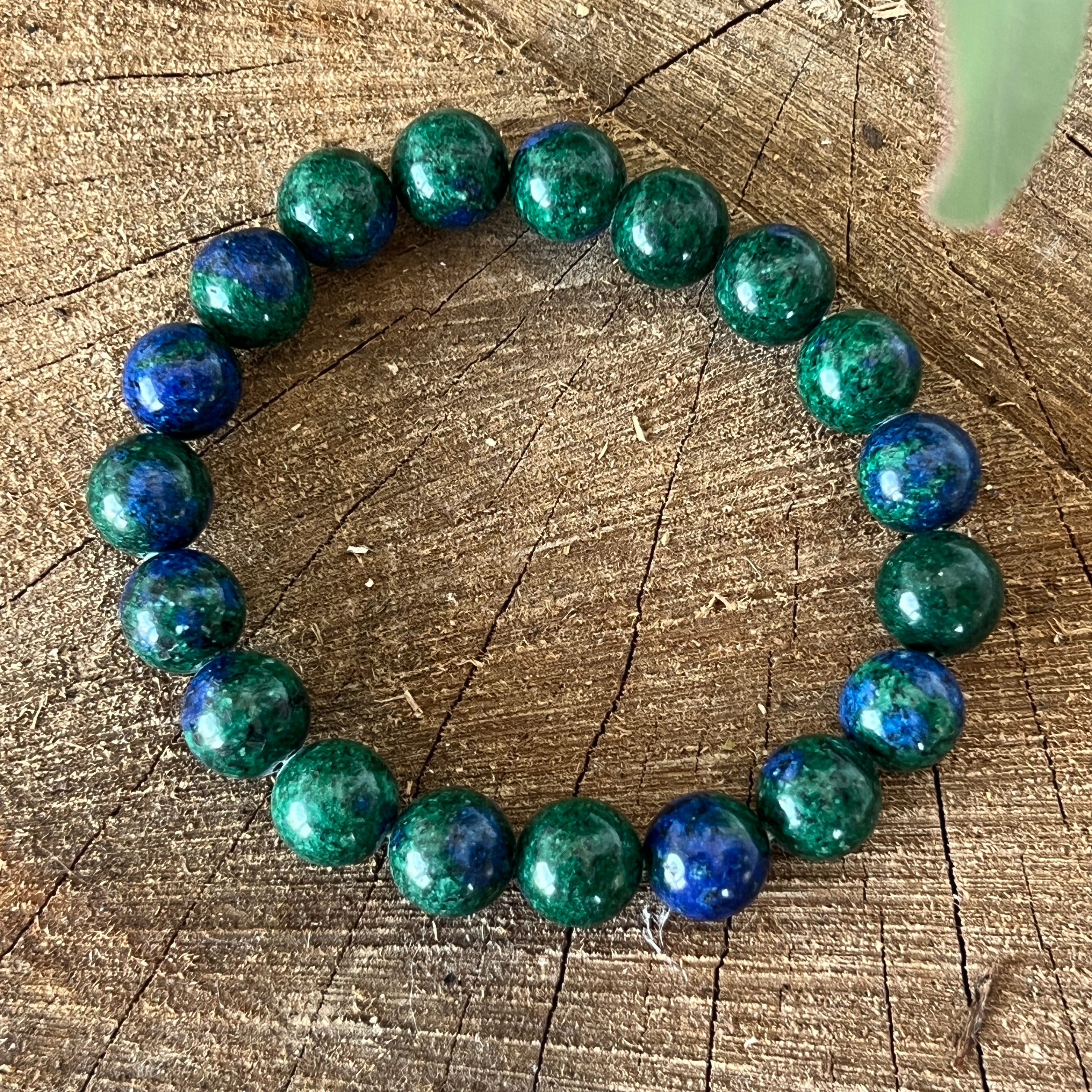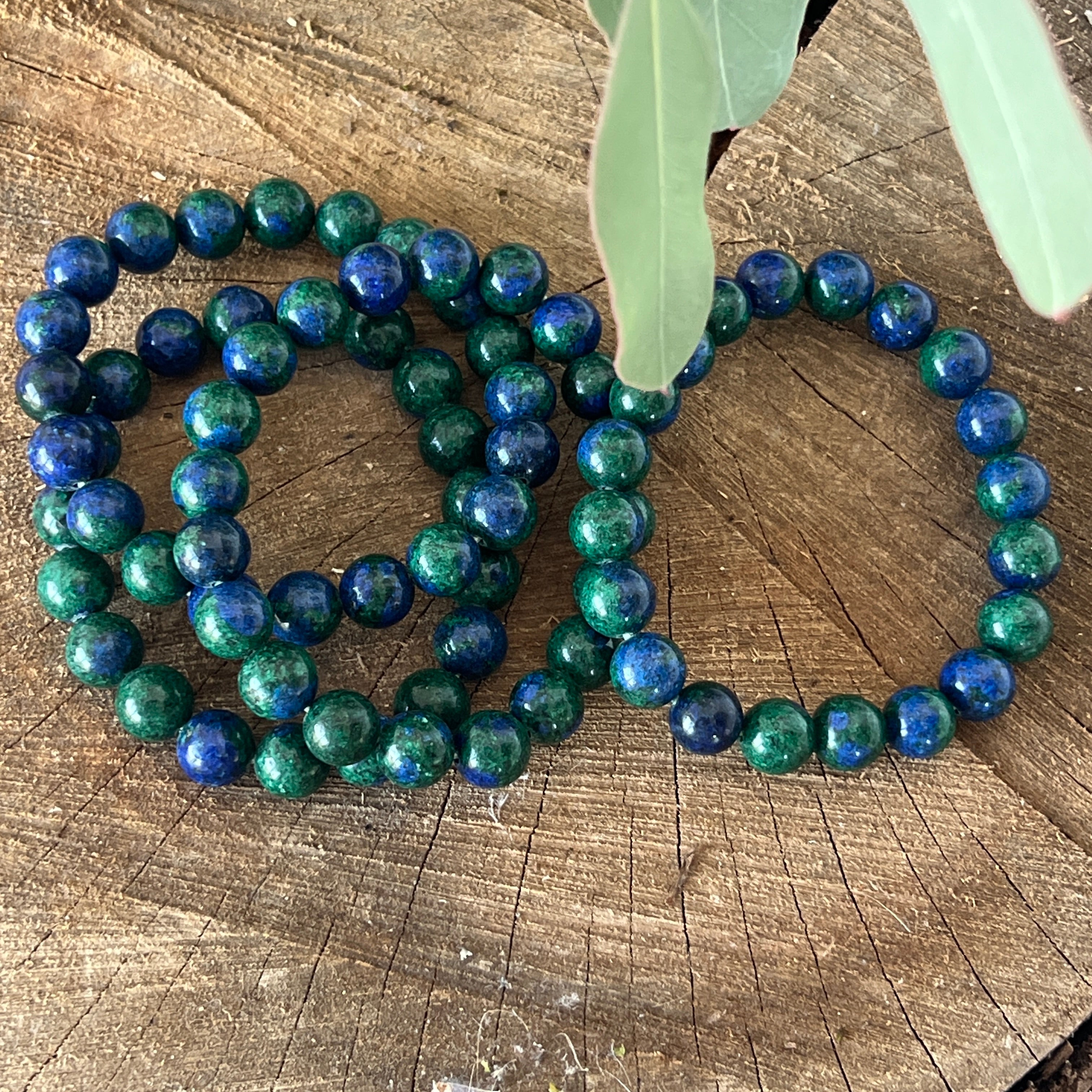 Această brățară este realizată din mărgele naturale de azurit și malachit, două minerale cu o frumusețe aparte, care se completează într-un joc de culori fascinant: albastrul intens al azuritului și verdele vibrant al malachitului.