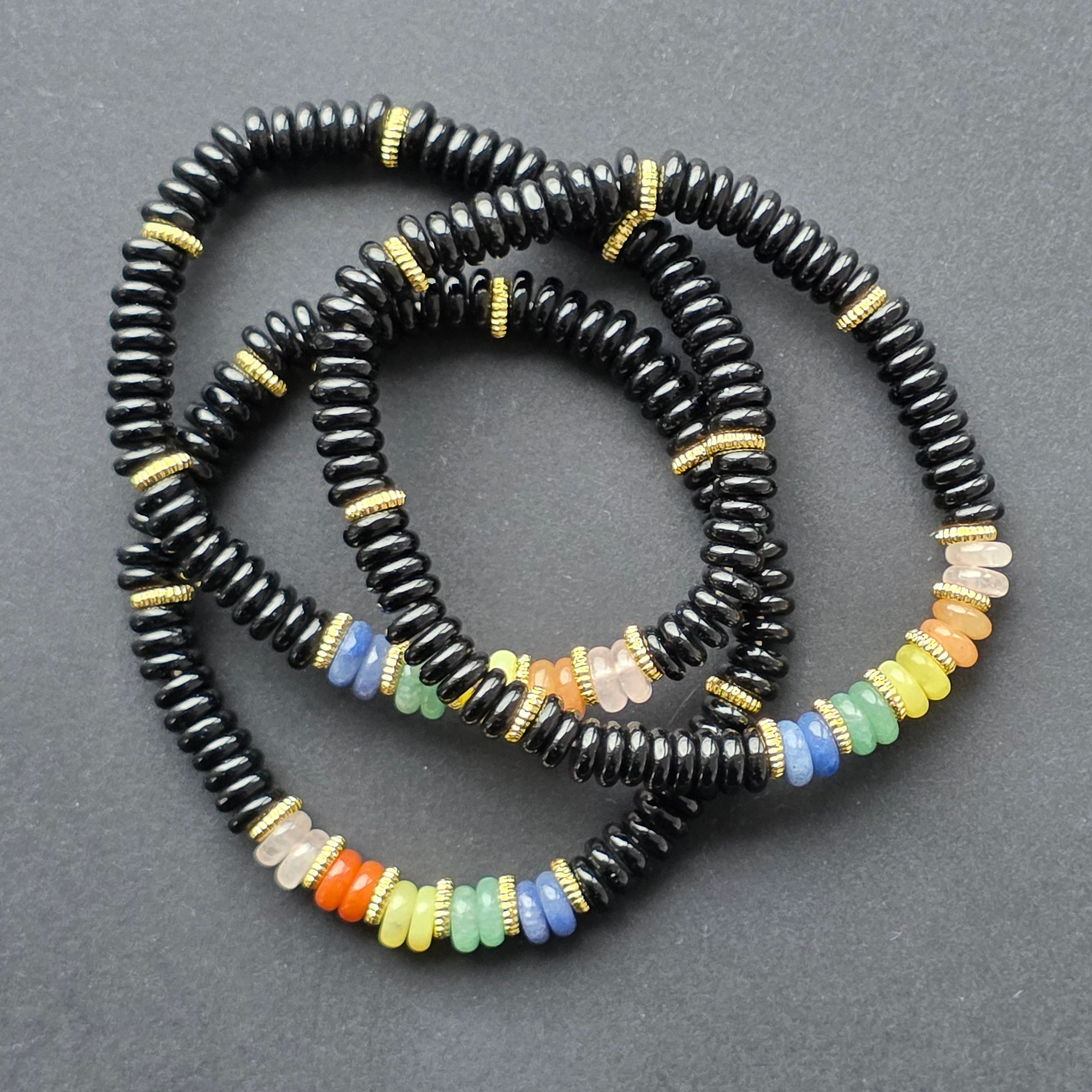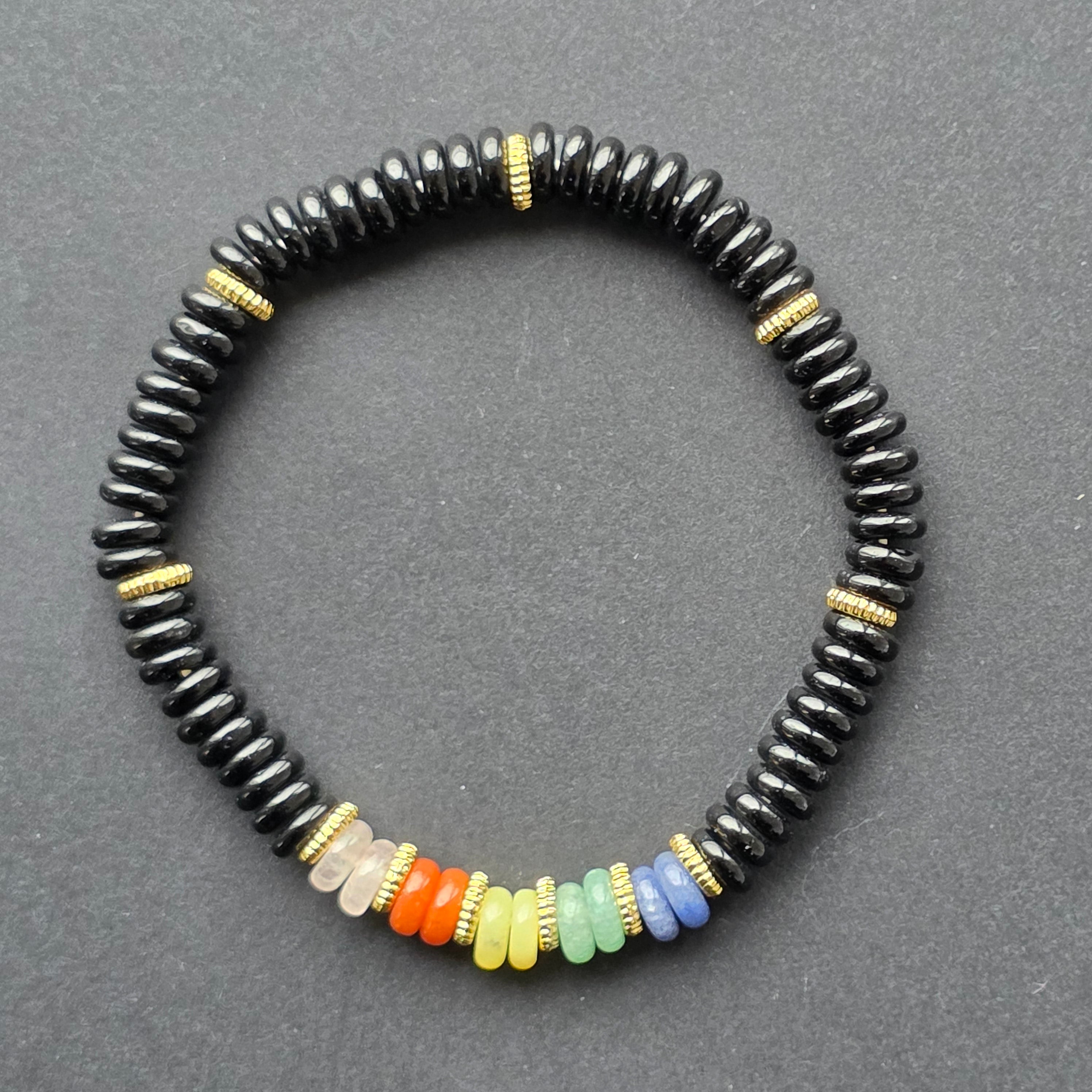 În partea centrală, segmentul „7 chakre” aduce o explozie discretă de culoare — roșu, portocaliu, galben, verde, albastru, indigo și violet — creând o armonie subtilă între profunzime și luminozitate. Este detaliul care transformă brățara într-o piesă cu personalitate, echilibrând vibrația calmă a onixului cu energia culorilor.