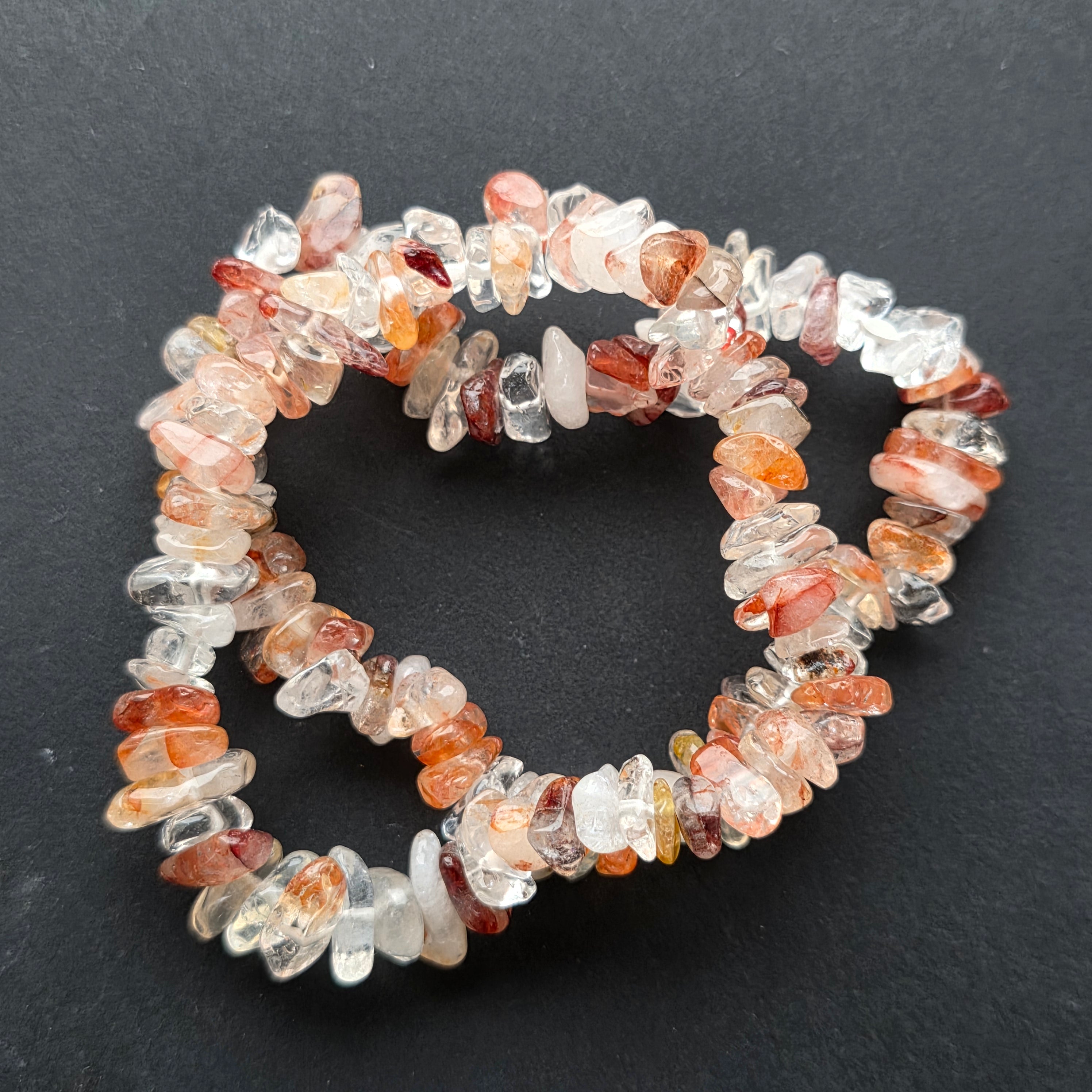 • Pietre: cuart incolor + cuart hematoid roșu – chipsuri naturale, neregulate