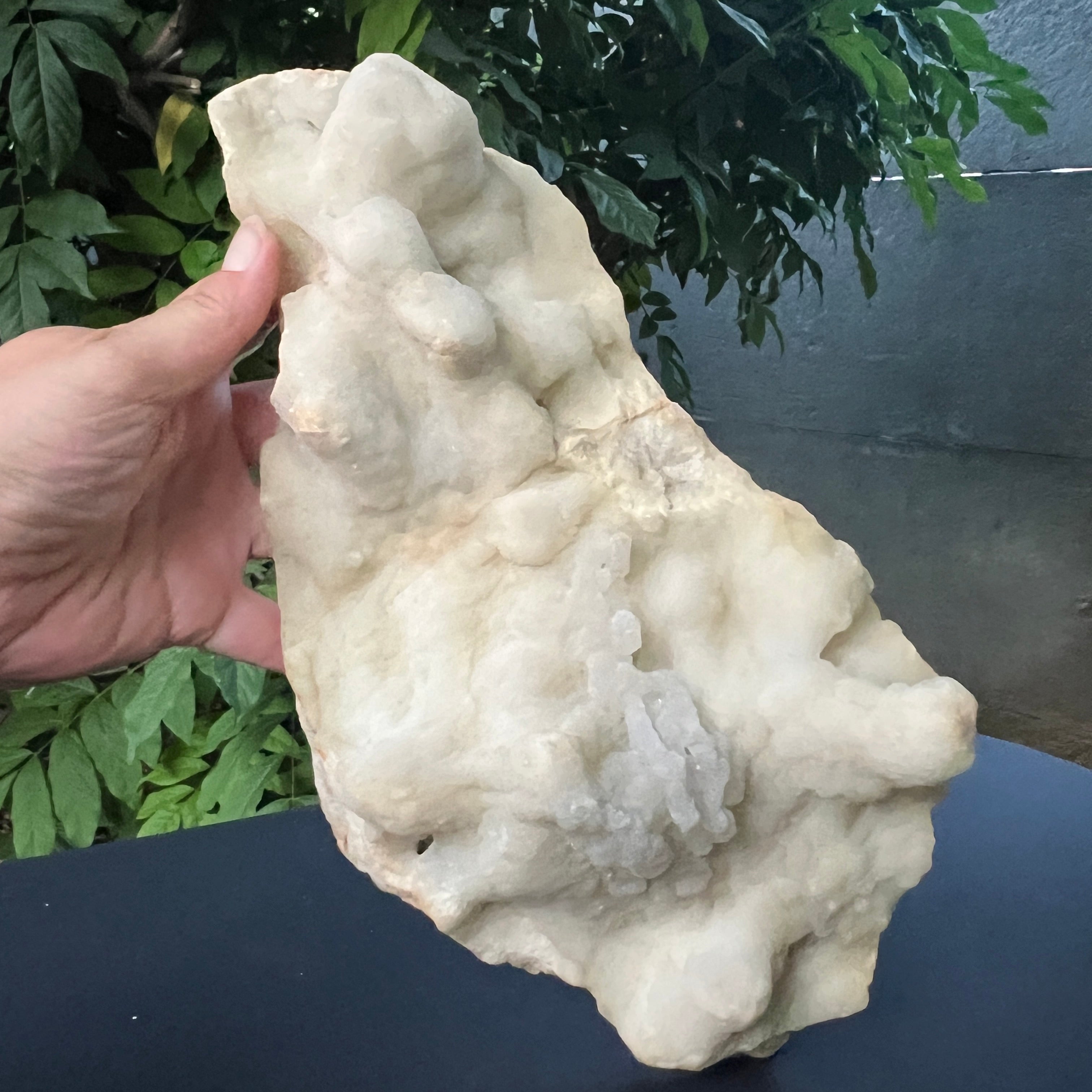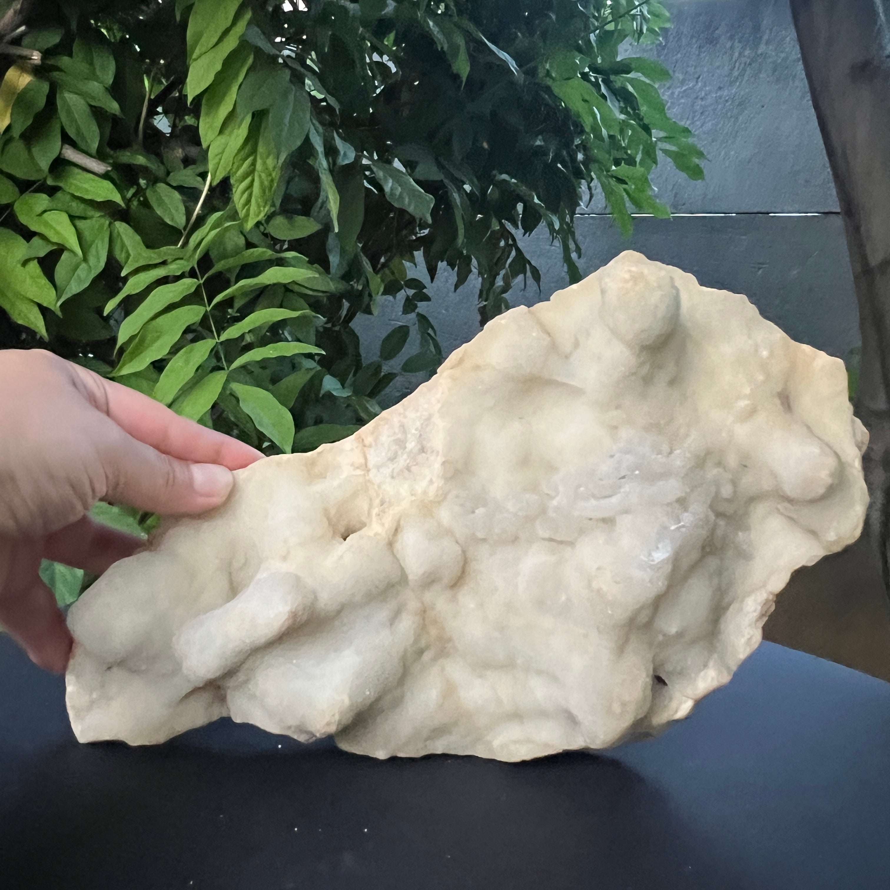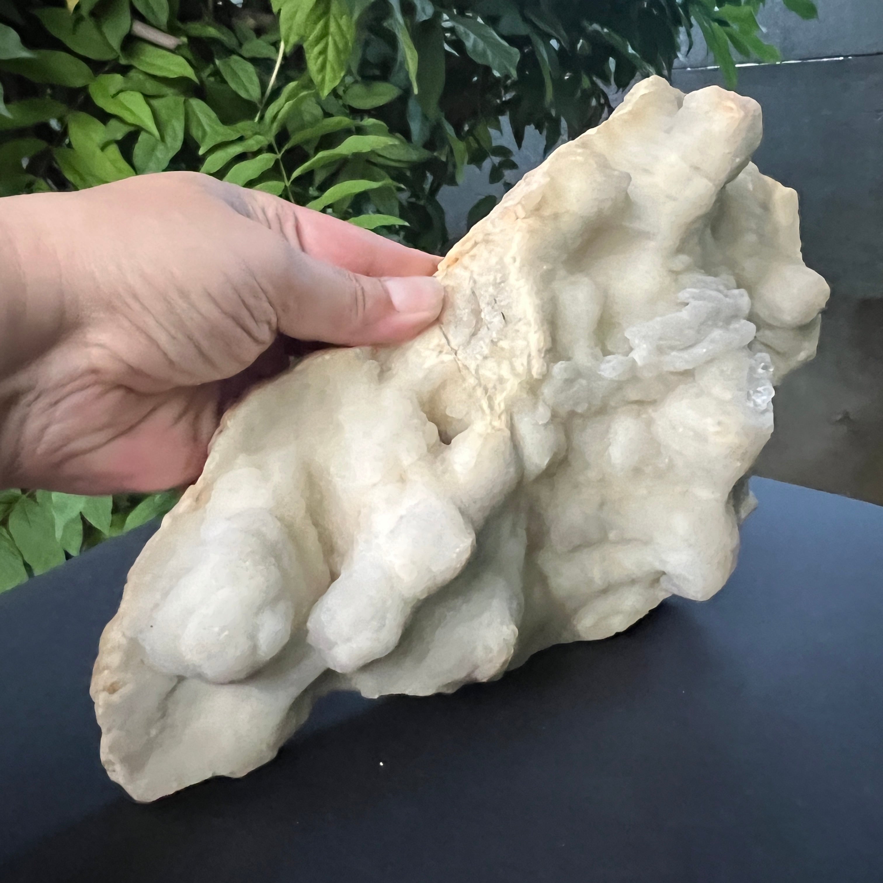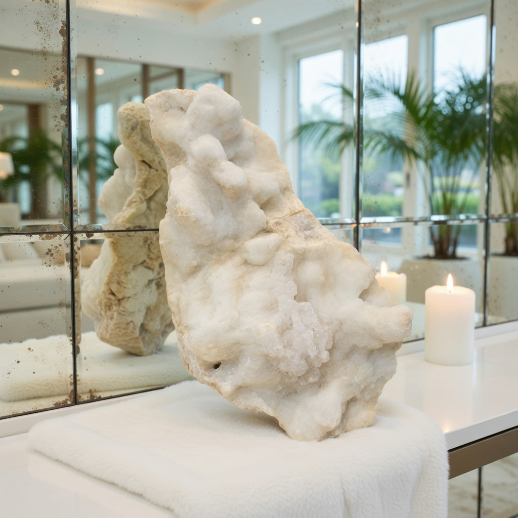 Culoarea alb-crem, cu nuanțe bej discrete, este pusă în valoare de strălucirea subtilă a microcristalelor de la suprafață, care reflectă lumina într-un mod blând și elegant. Detaliile fine, aspectul coraliform și forma armonioasă fac din această piesă o prezență vizuală remarcabilă.