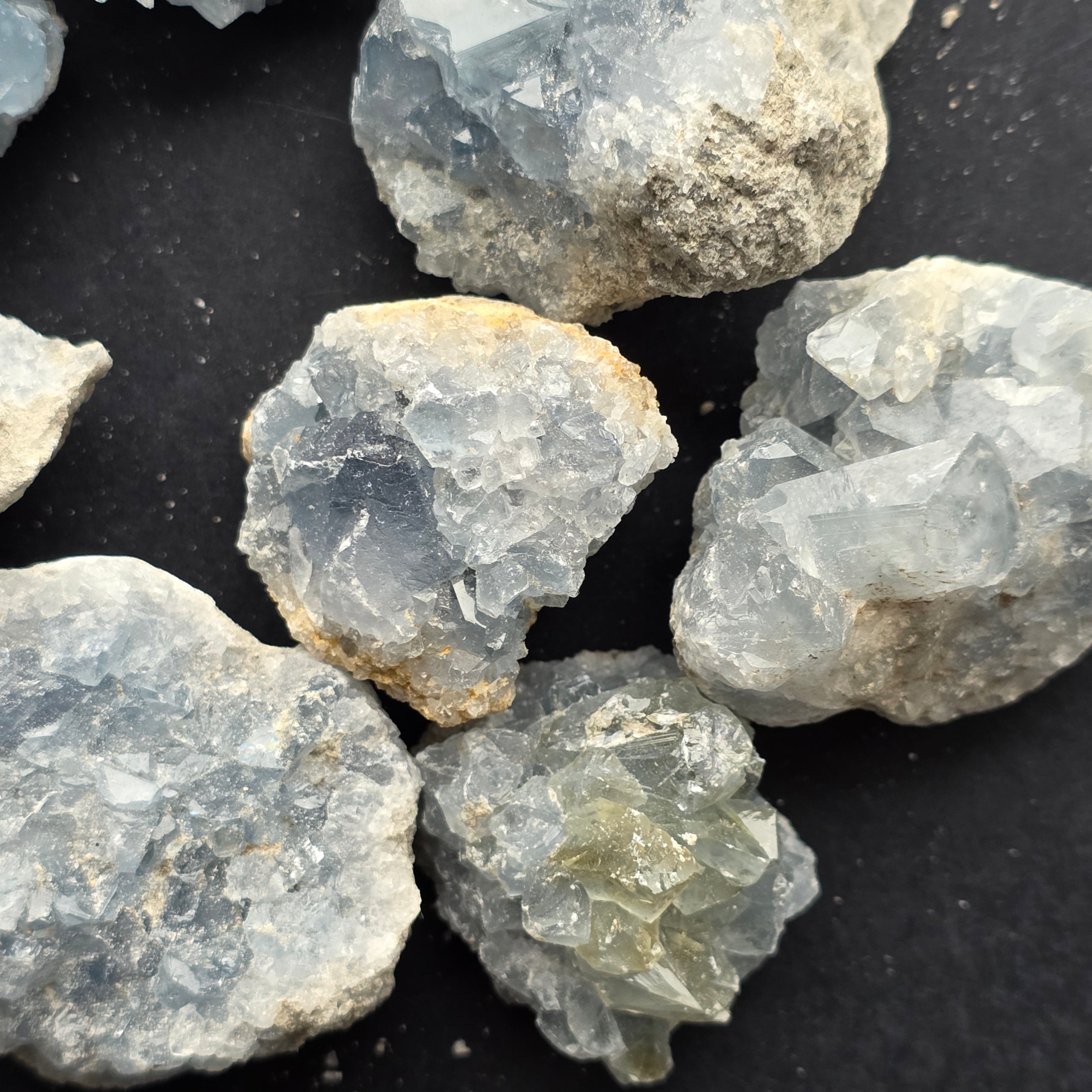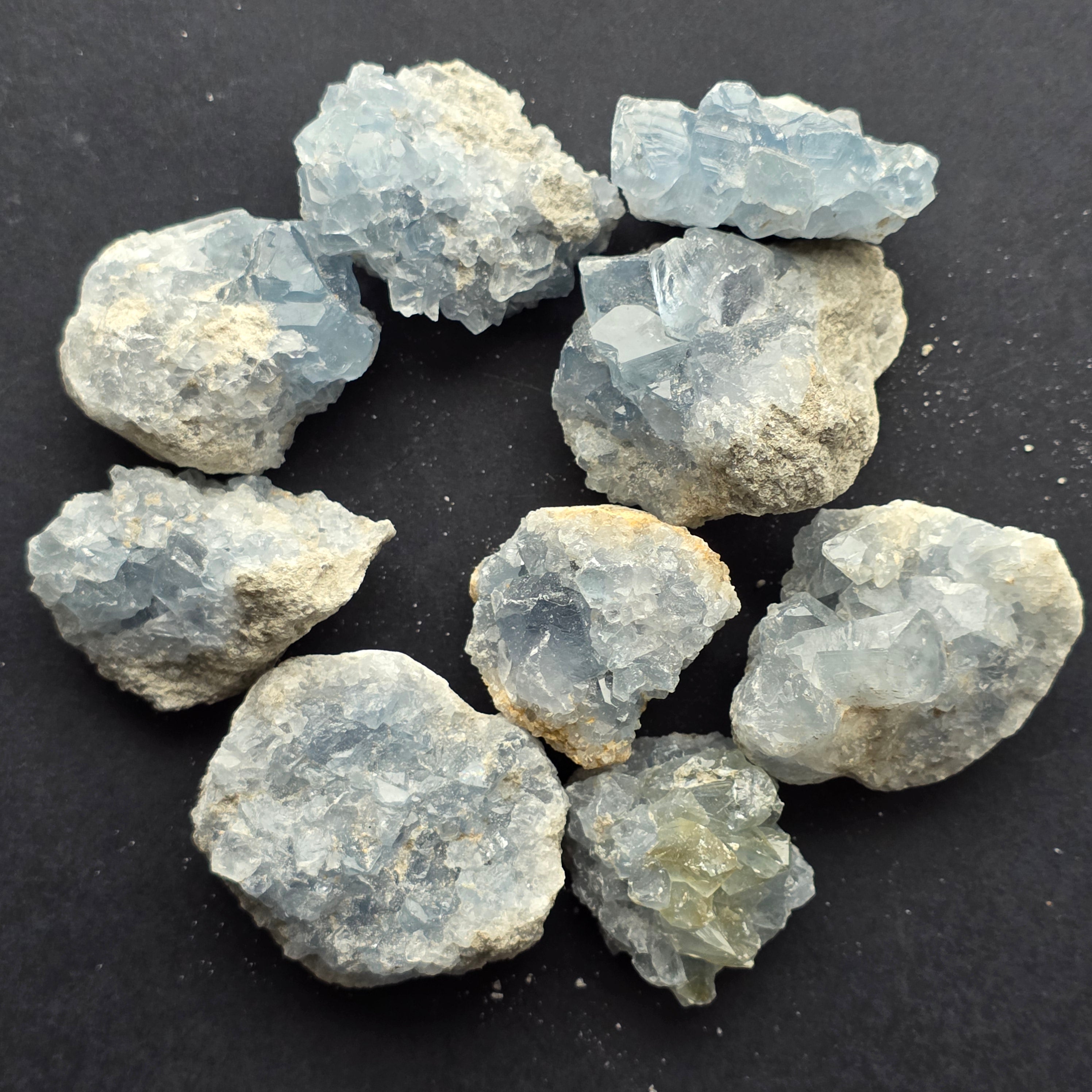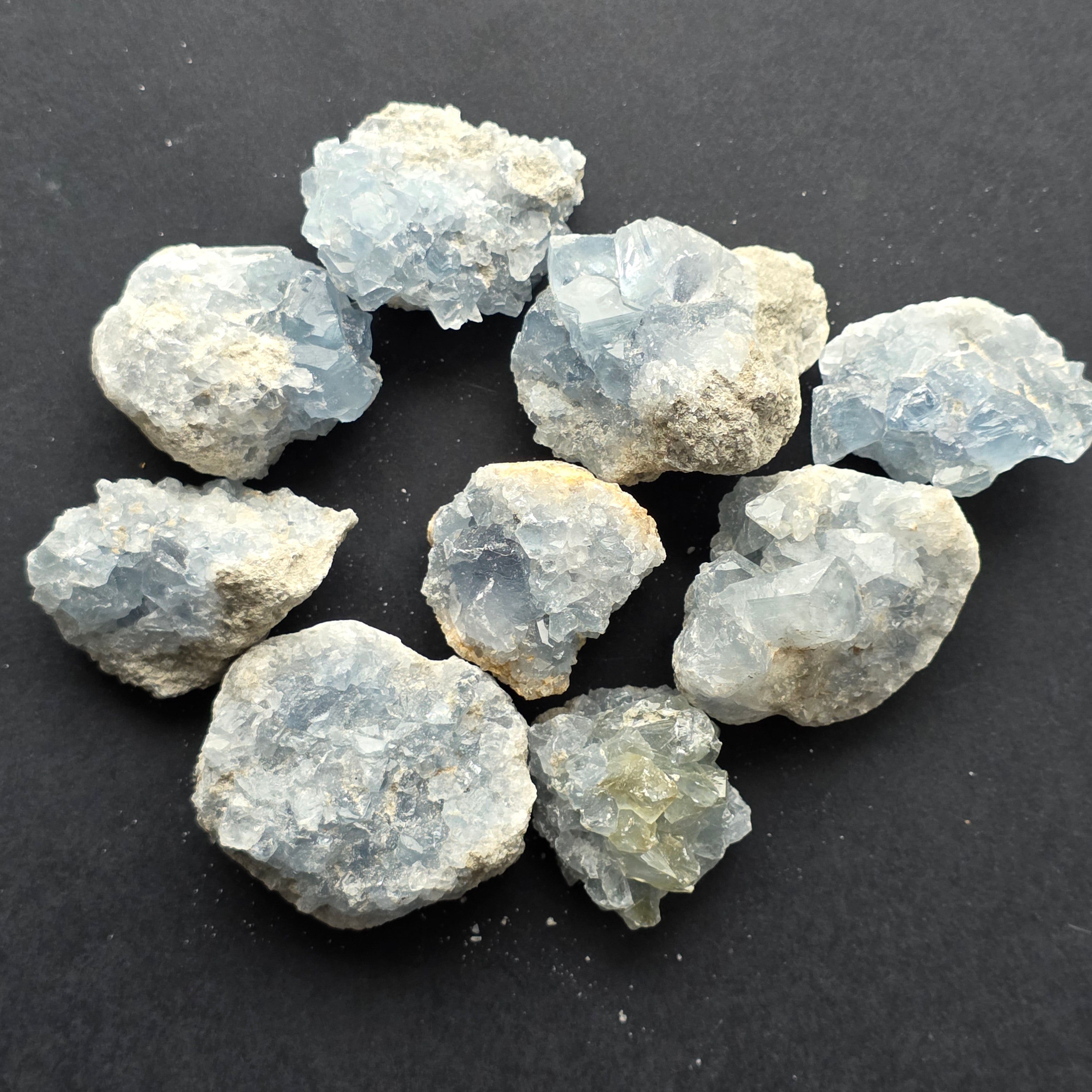 La celestite è una pietra semipreziosa di colore blu o incolore, composta da solfato di stronzio. Ha proprietà calmanti e rilassanti, ed è spesso usata nella meditazione e nelle pratiche spirituali per promuovere la pace interiore e la chiarezza mentale. La celestite è associata al chakra della gola e può aiutare nella comunicazione chiara e nell'esprimere le emozioni. Si crede inoltre che migliori la creatività, l'intuizione e le capacità psichiche.