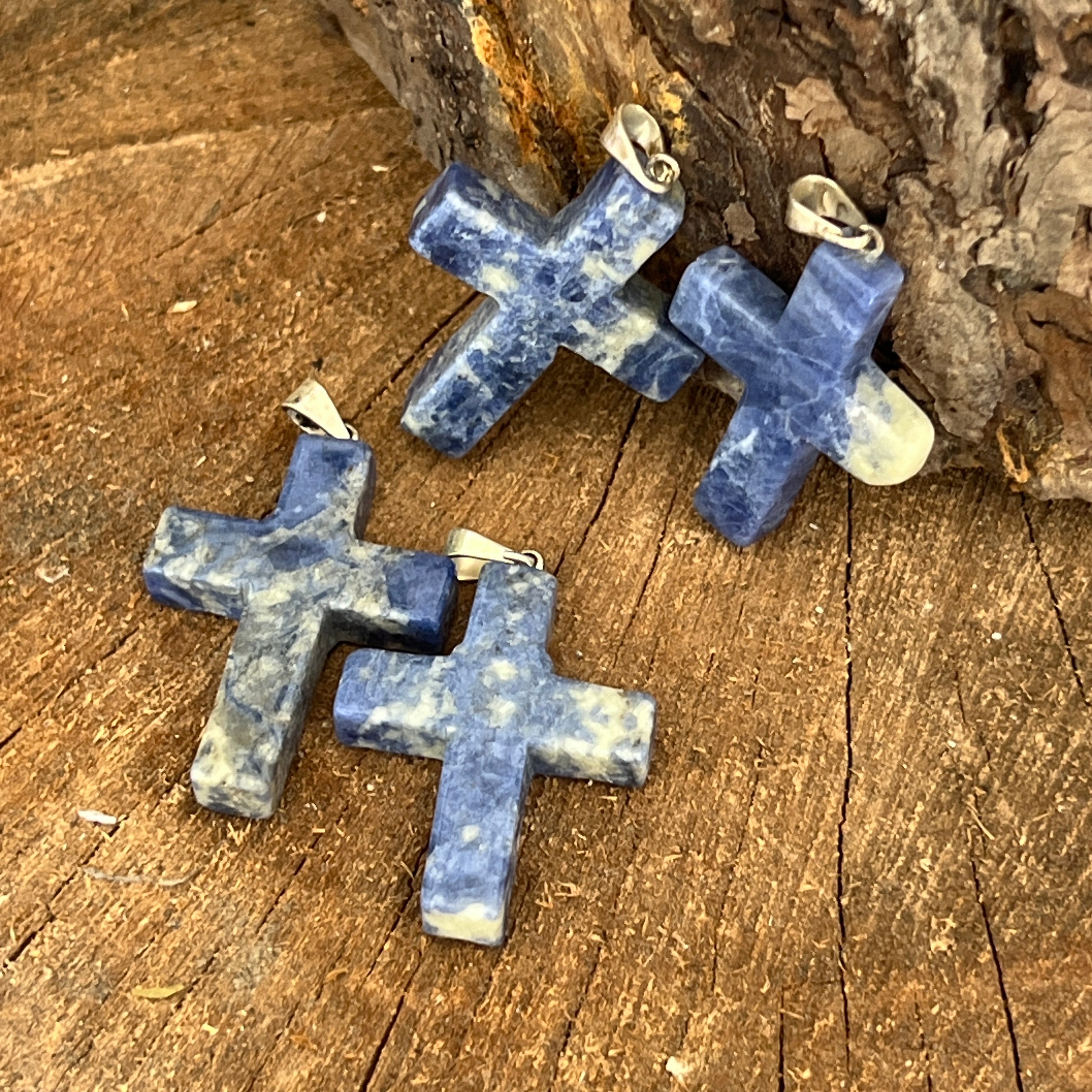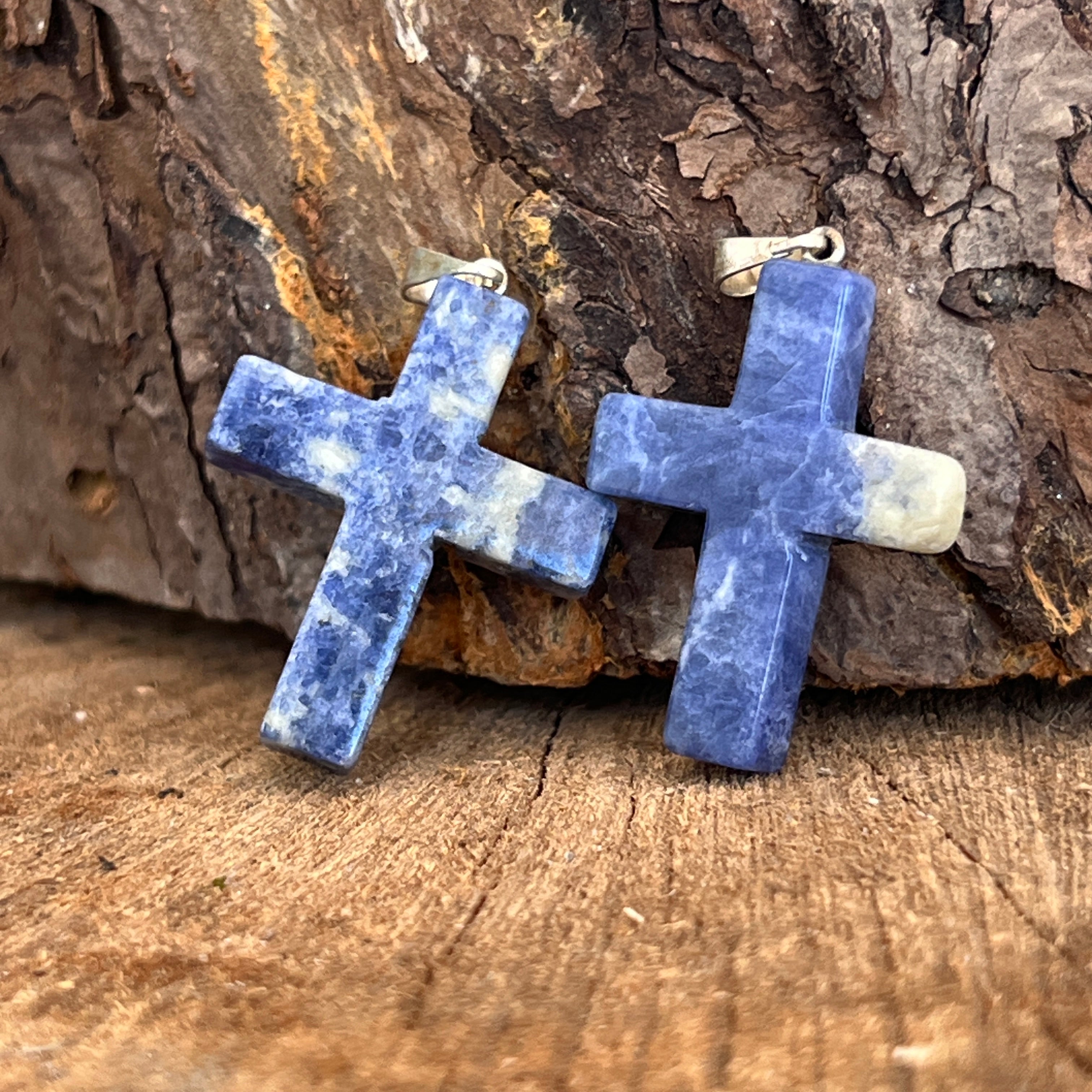 Il ciondolo croce in sodalite unisce il simbolo della fede alla bellezza del blu intenso, attraversato da vene bianche naturali.