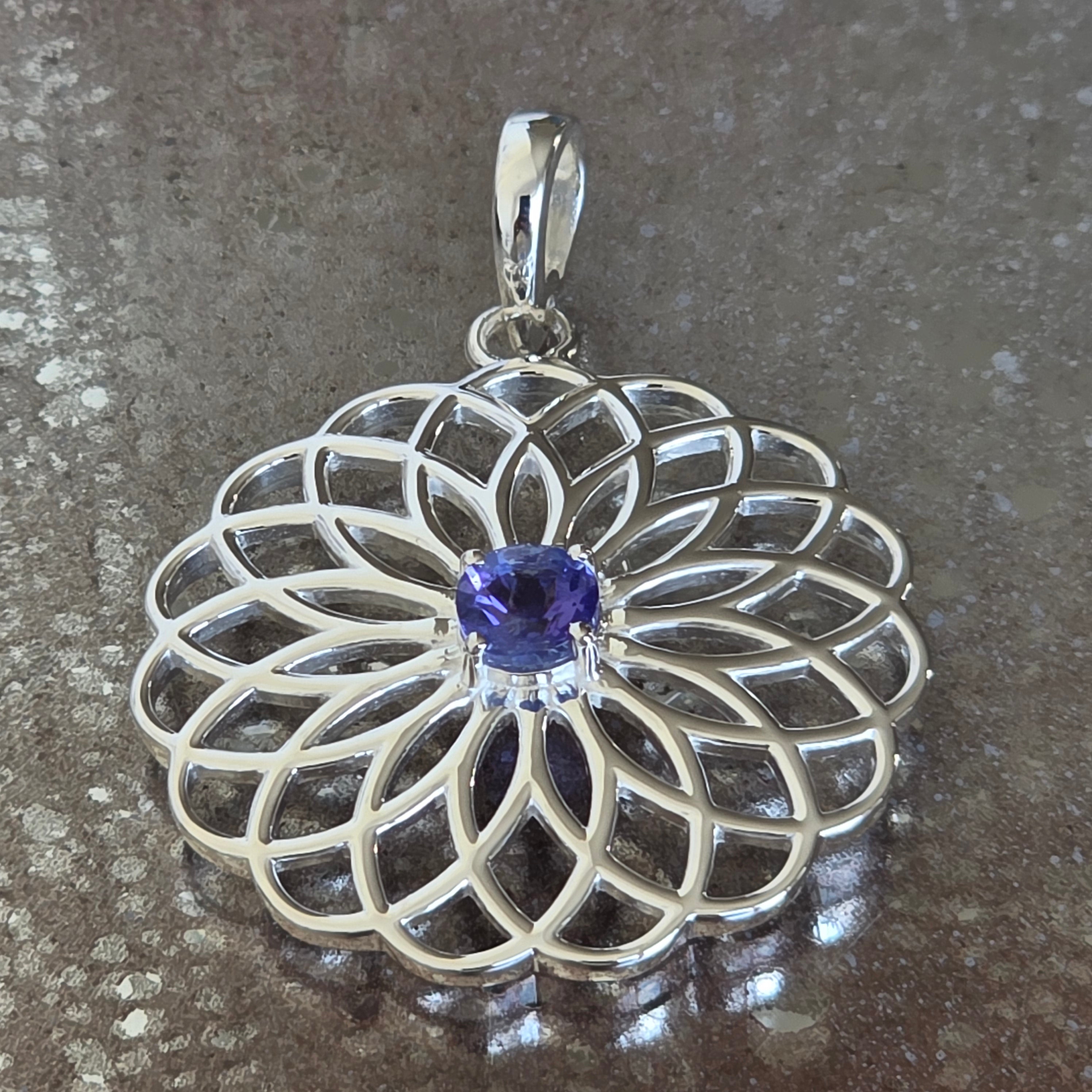 Il ciondolo "Fiore della Vita" con tanzanite è un gioiello con un simbolismo profondo, in cui la geometria sacra si incontra con l'eleganza sottile di una pietra rara.