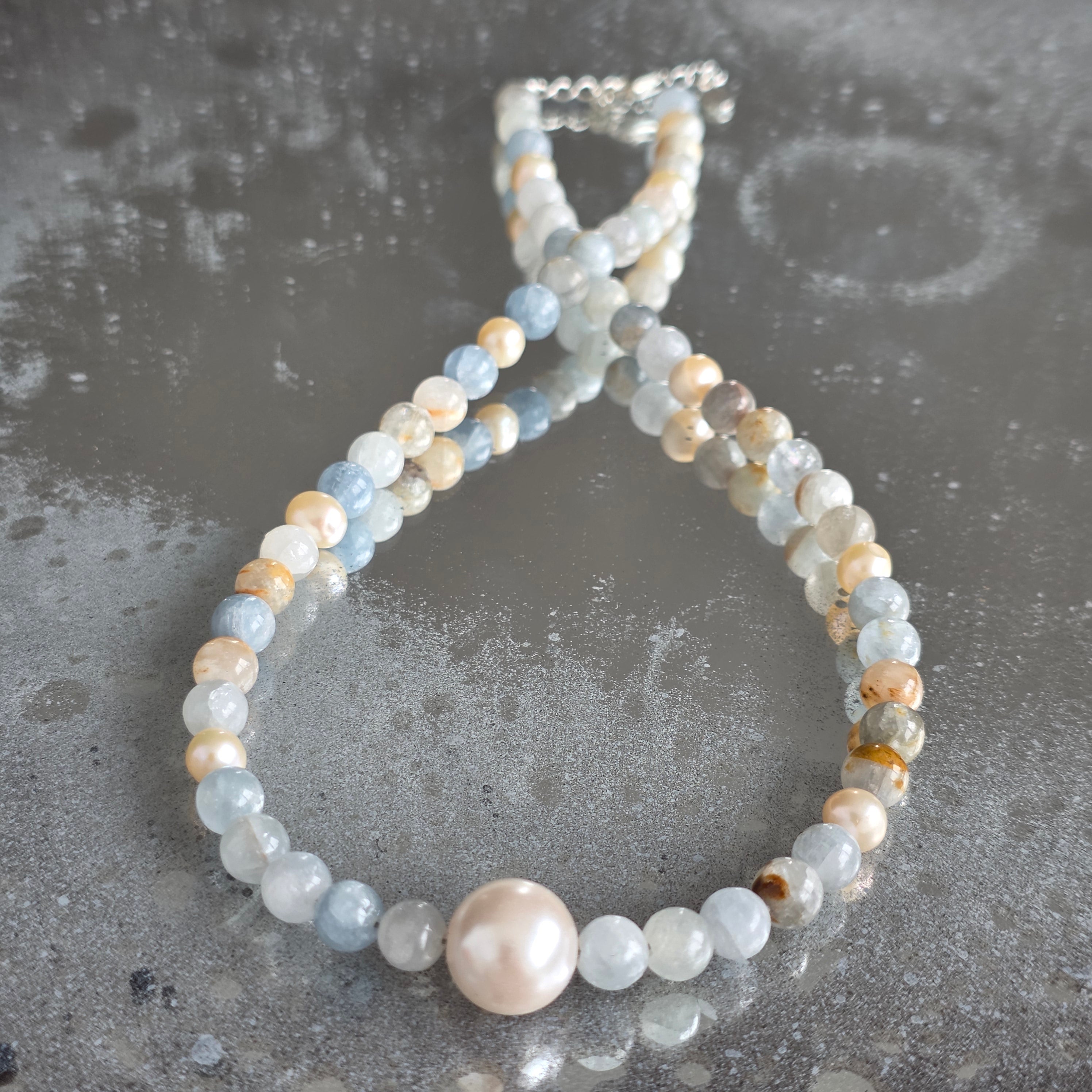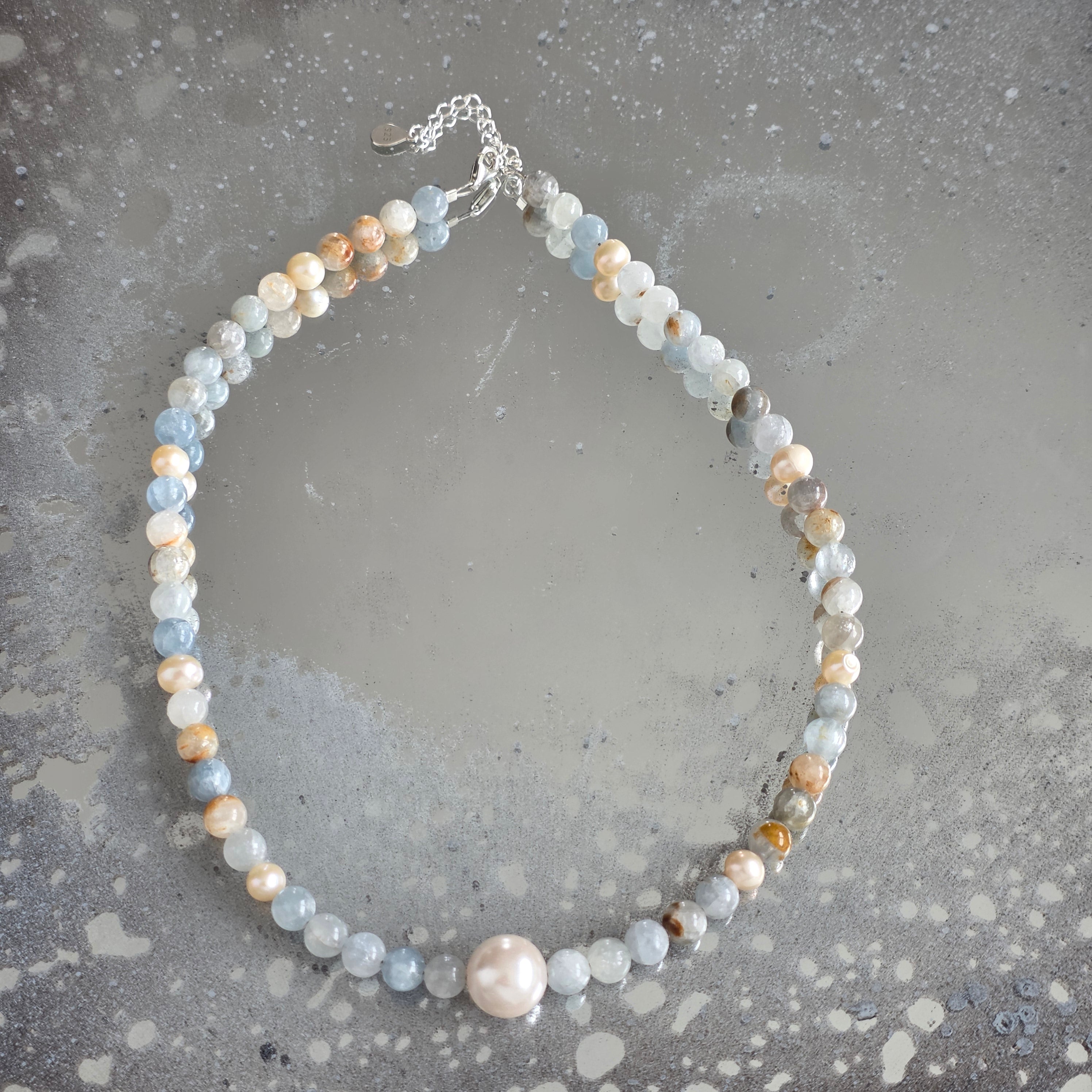 Acest colier este realizat din celestit natural, ales pentru nuanțele sale delicate de albastru deschis și pentru aspectul său aerat, aproape translucid. Sferele de 6 mm sunt atent selecționate și șlefuite, punând în valoare textura fină a pietrei și strălucirea sa calmă, discretă.