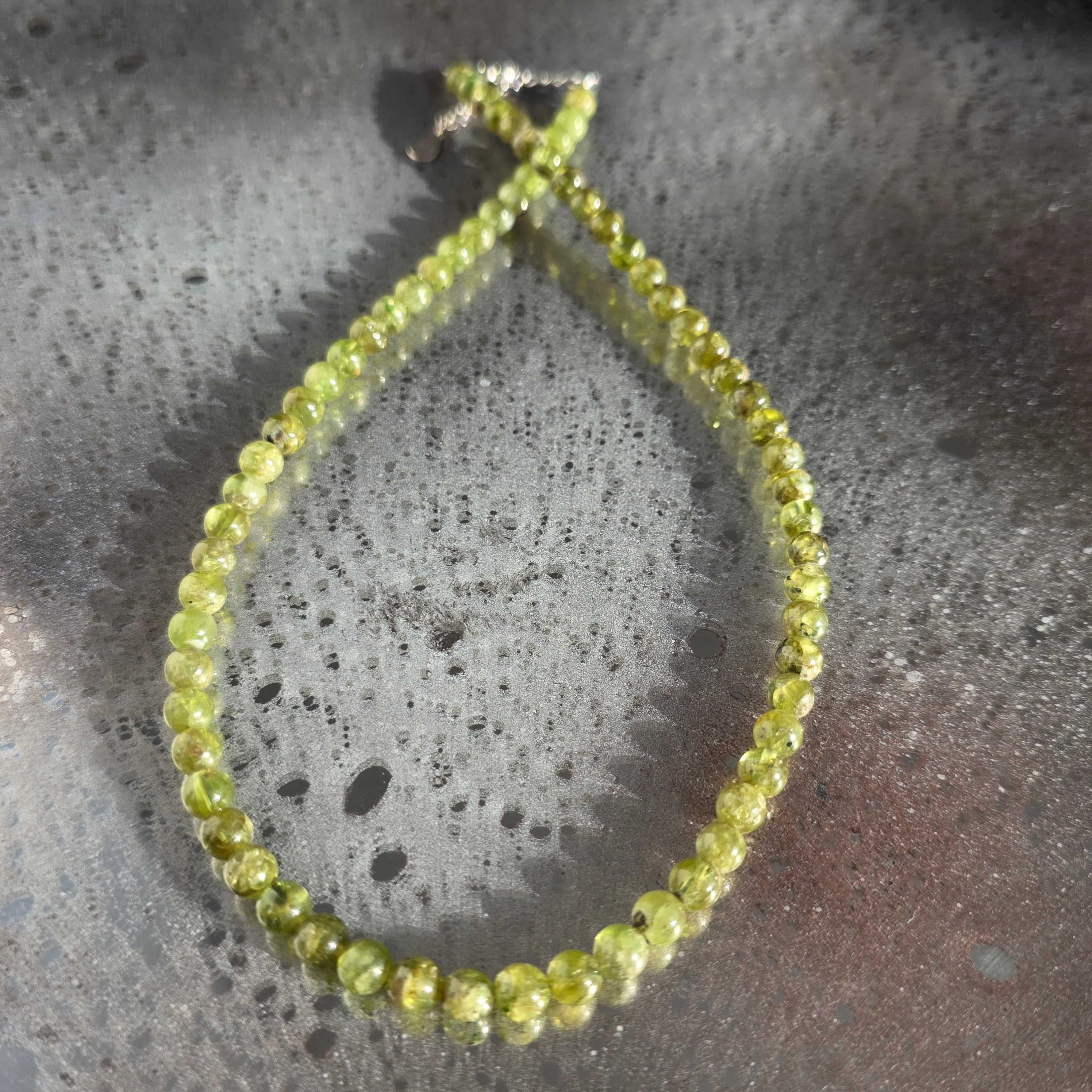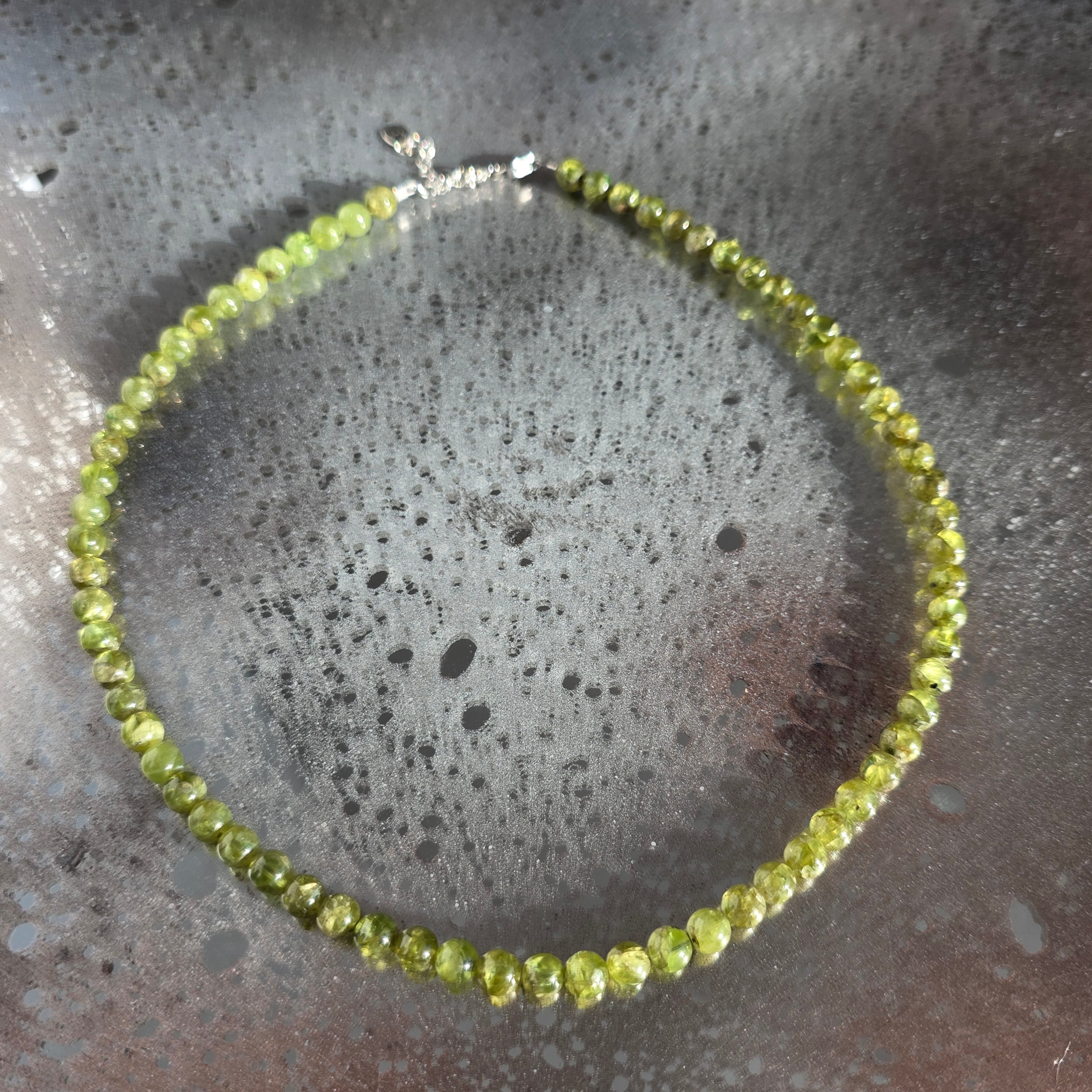 Un colier luminos și proaspăt, realizat din sfere de peridot de 6 mm, atent selecționate pentru calitatea lor AAA, cu o culoare verde intensă și clară, care pare să pulseze de viață. Fiecare sferă reflectă lumina cu o transparență caldă, evocând ideea de început nou, de respirație adâncă după o etapă încheiată. Designul este curat și echilibrat, lăsând piatra să fie centrul expresiei.