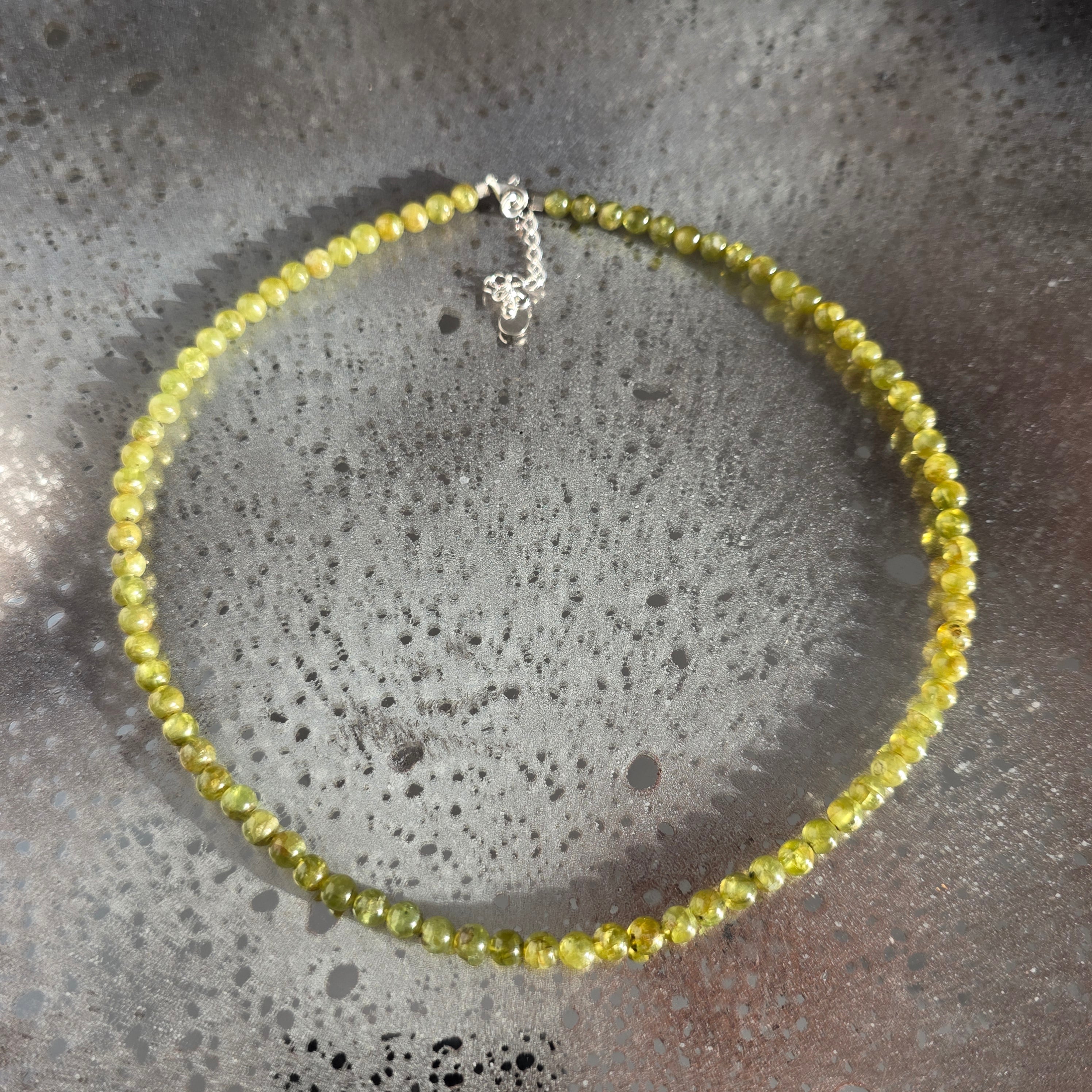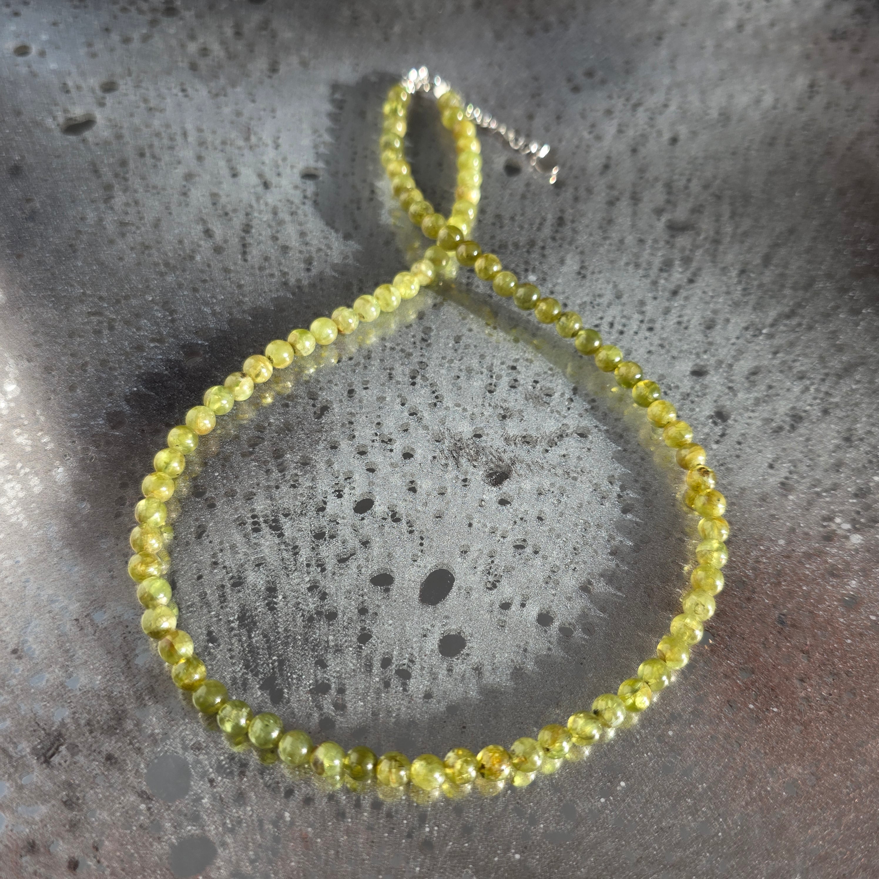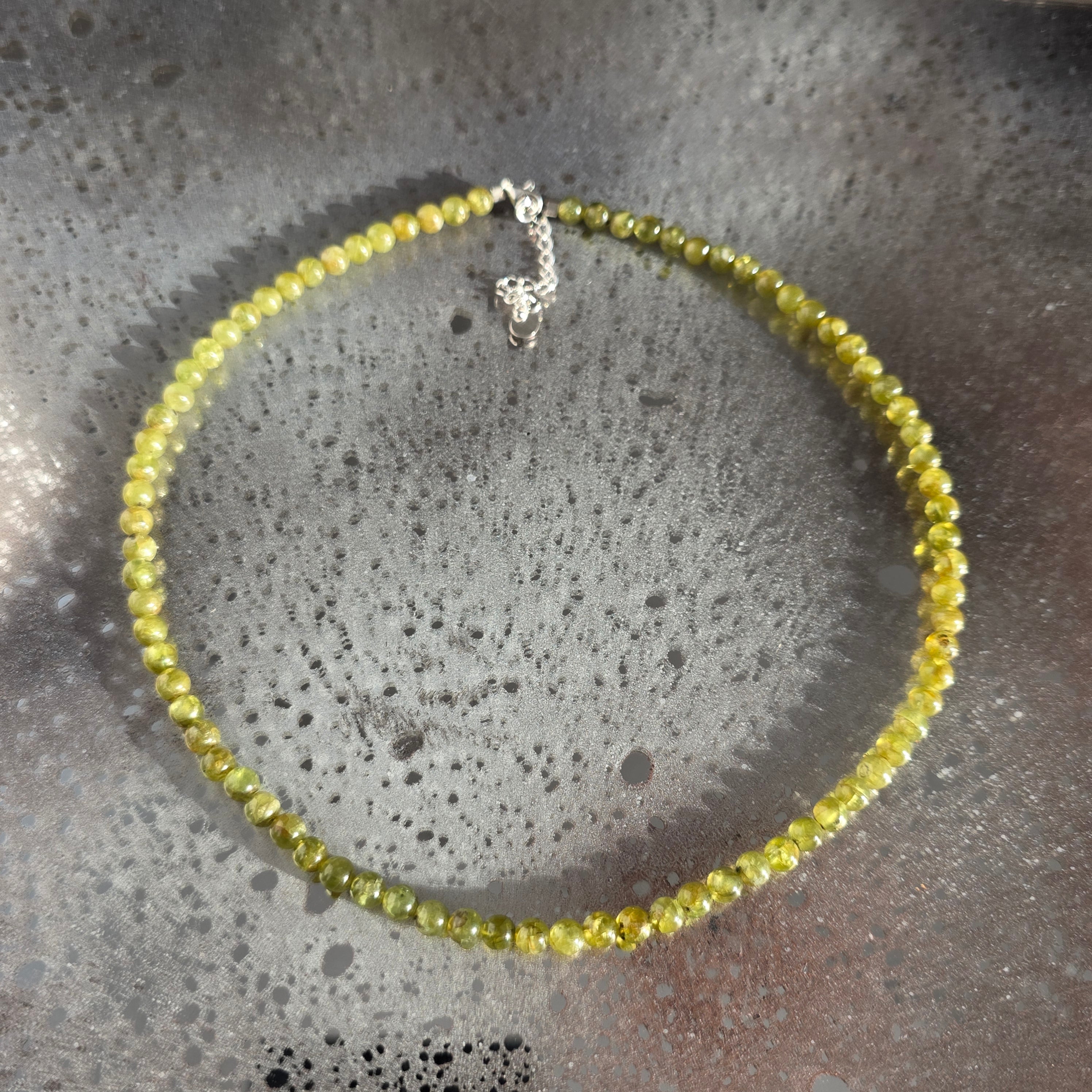 Un colier luminos și proaspăt, realizat din sfere de peridot de 5 mm, atent selecționate, cu o culoare verde intensă și clară, care pare să pulseze de viață. Fiecare sferă reflectă lumina cu o transparență caldă, evocând ideea de început nou, de respirație adâncă după o etapă încheiată. Designul este curat și echilibrat, lăsând piatra să fie centrul expresiei.