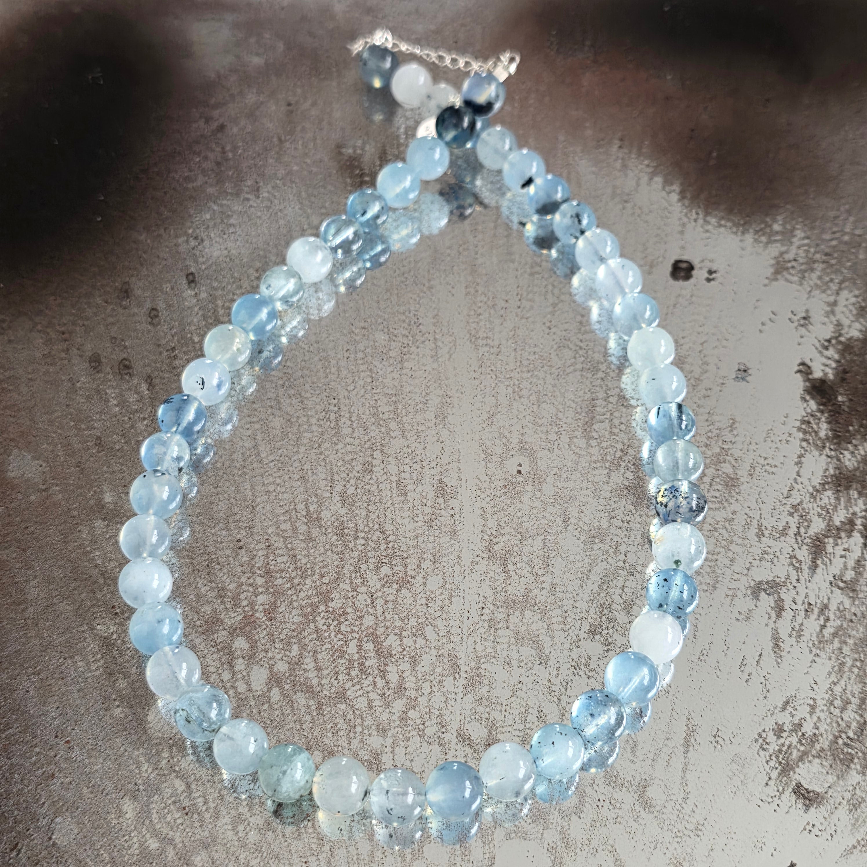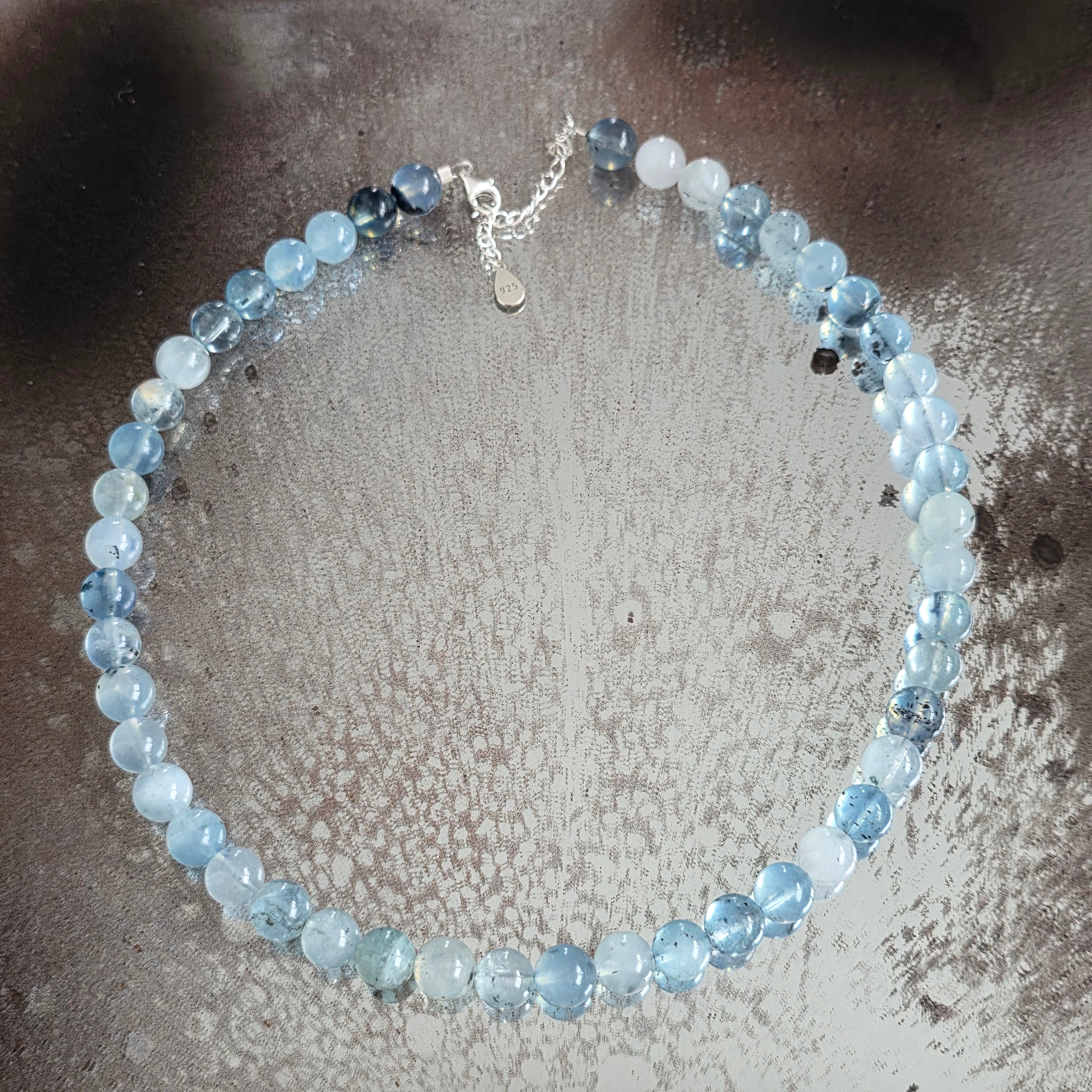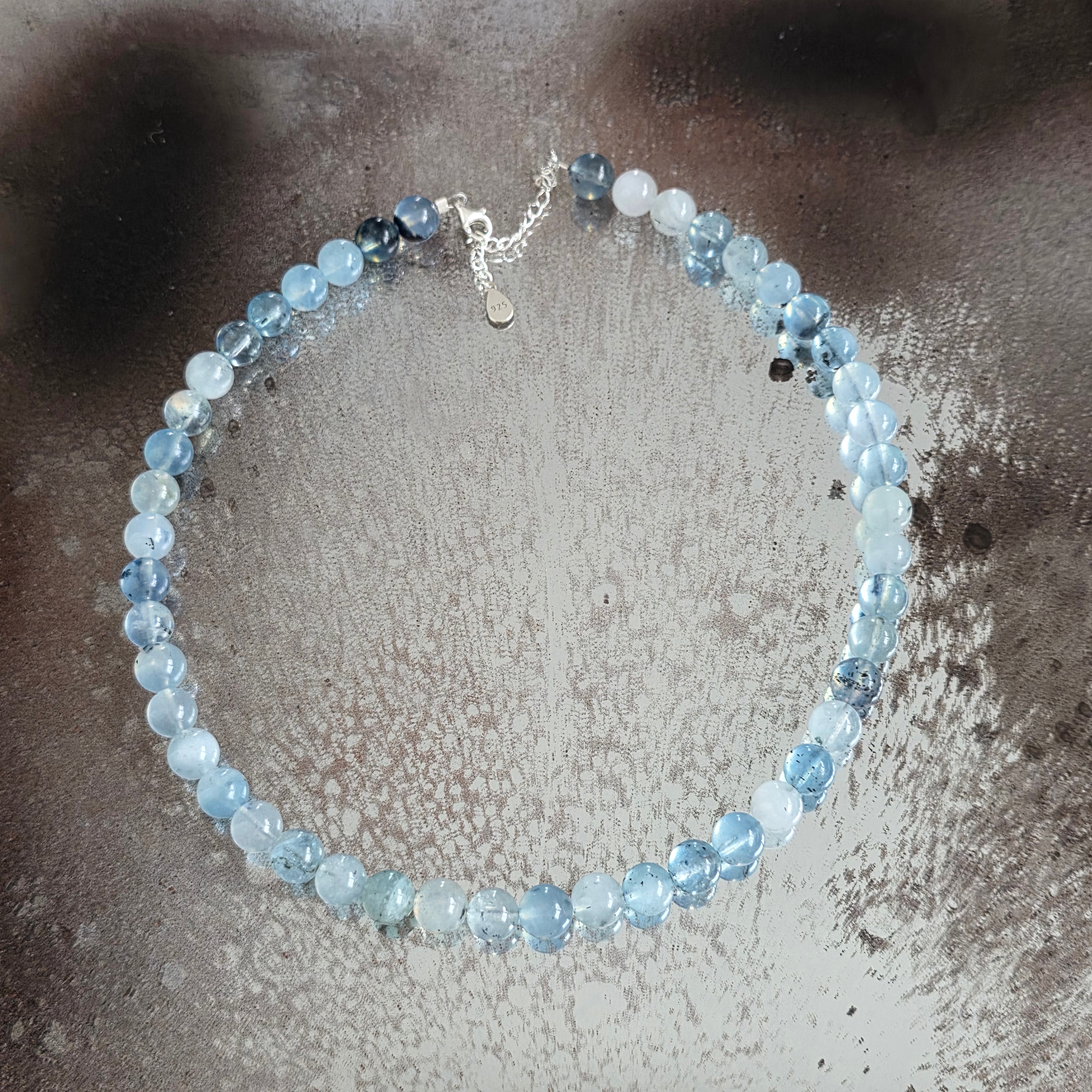 Materiali: acquamarina naturale con inclusioni sferiche da 9 mm, argento 925