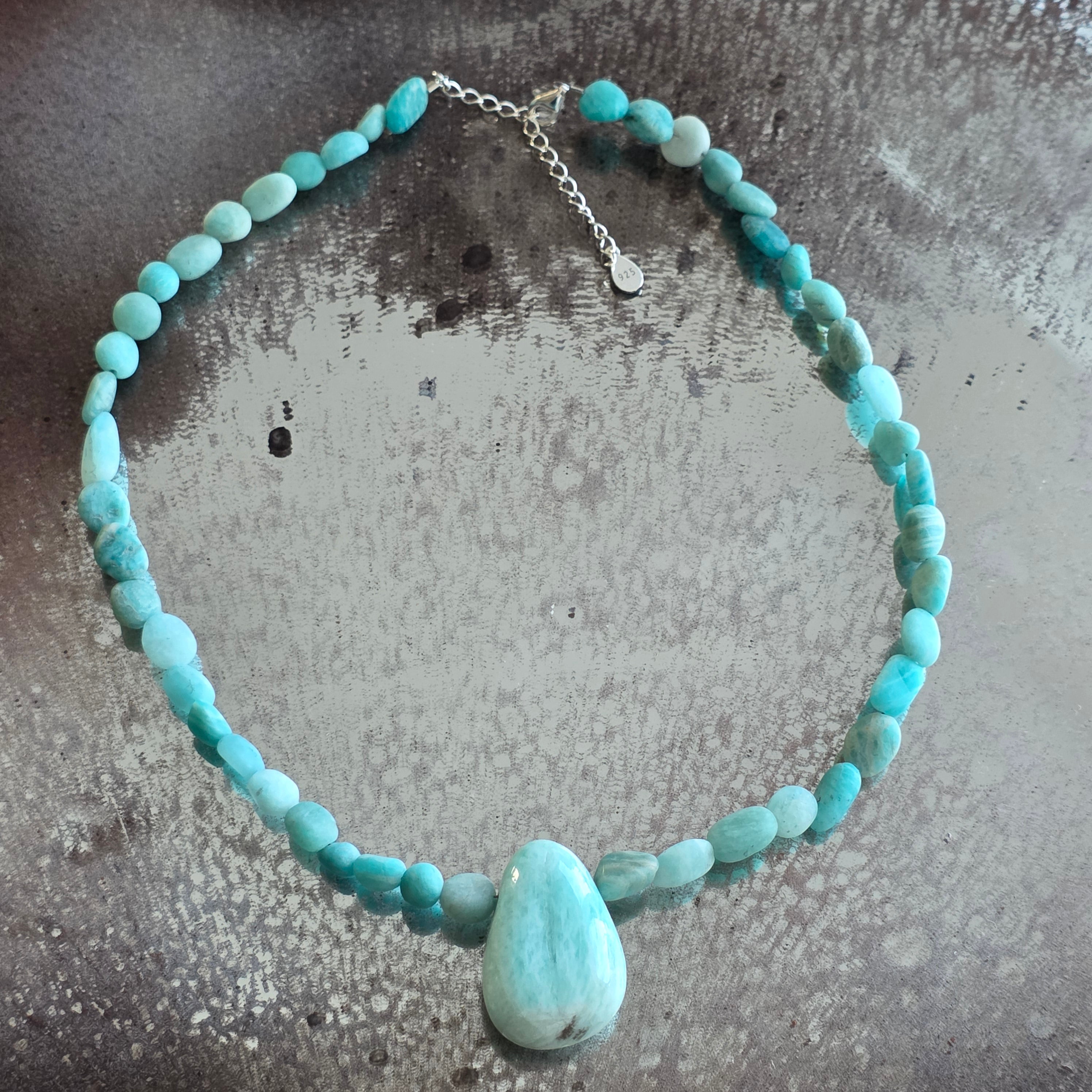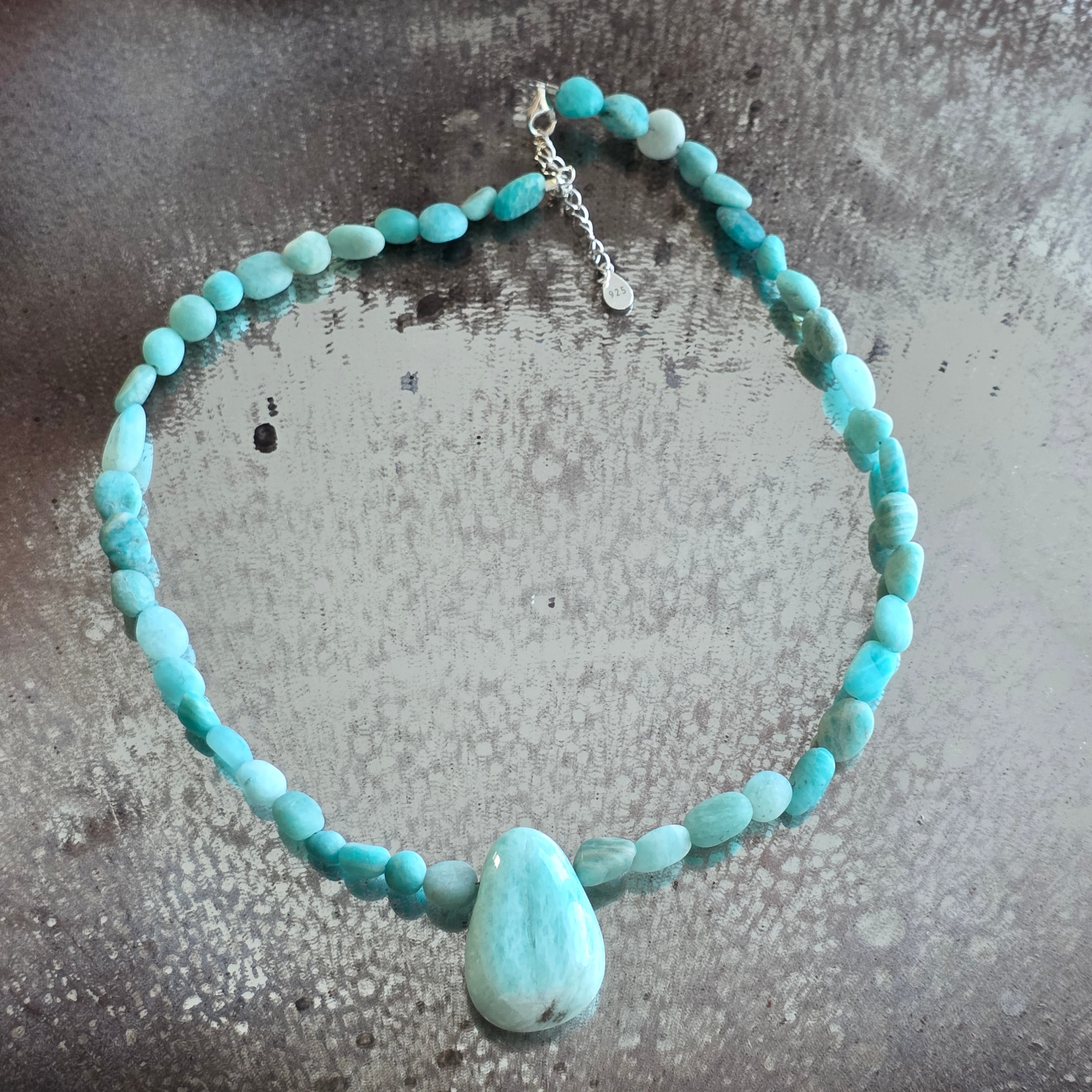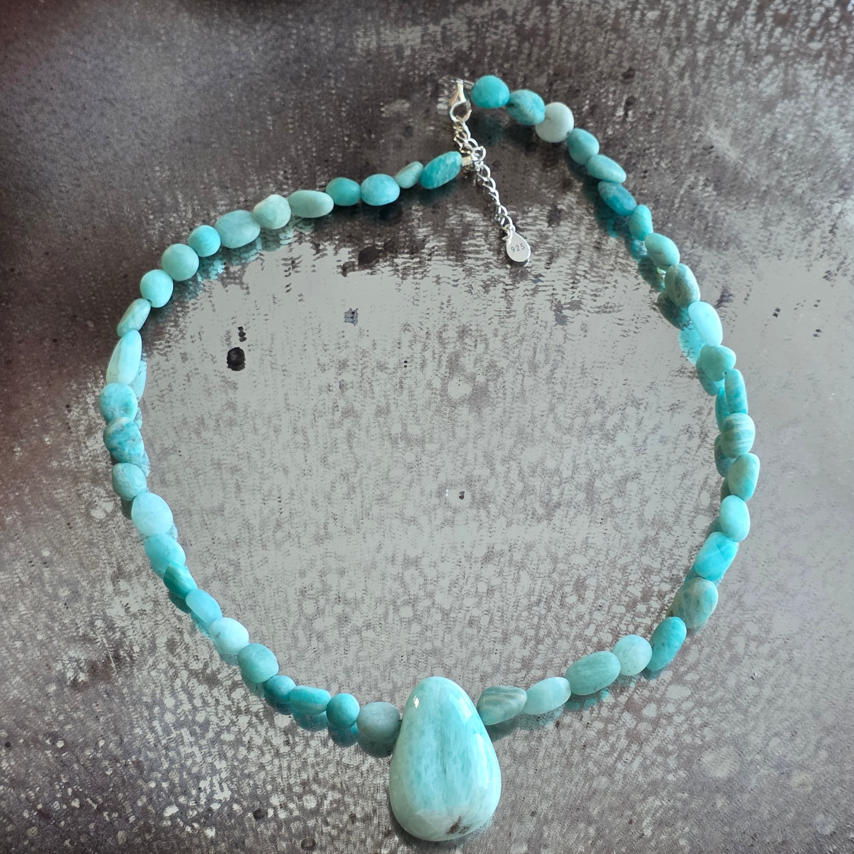 Materiali: amazonite naturale 8–10 mm, goccia di amazonite ~3 cm, argento 925