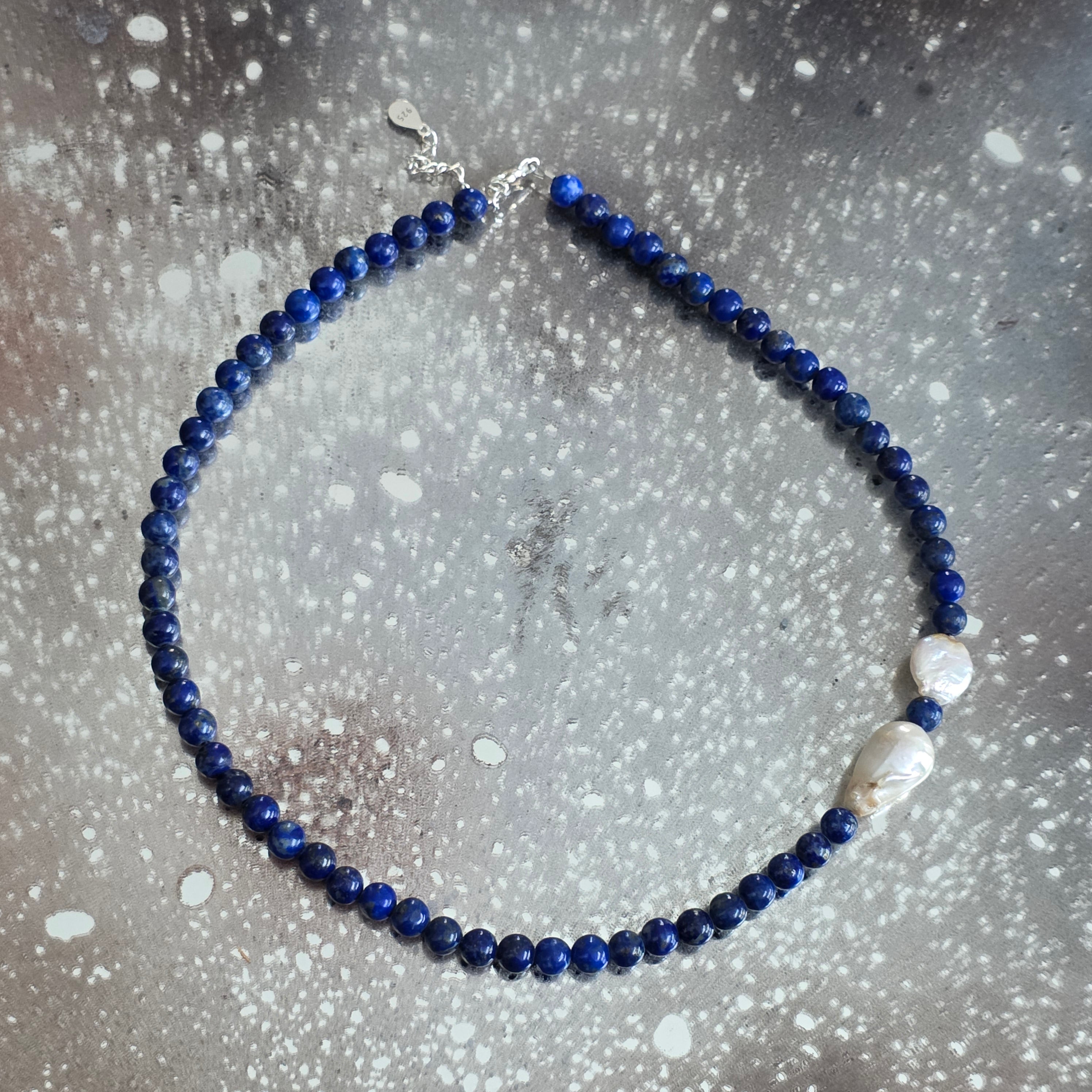 Realizzata in lapis lazuli naturale da 6 mm, con le sue tonalità profonde di blu e i riflessi dorati sottili della pirite, la collana è completata da due perle naturali che aggiungono un tocco di finezza ed equilibrio. Le perle sono posizionate con cura per evidenziare la bellezza naturale del lapis e per aggiungere un raffinato contrasto.