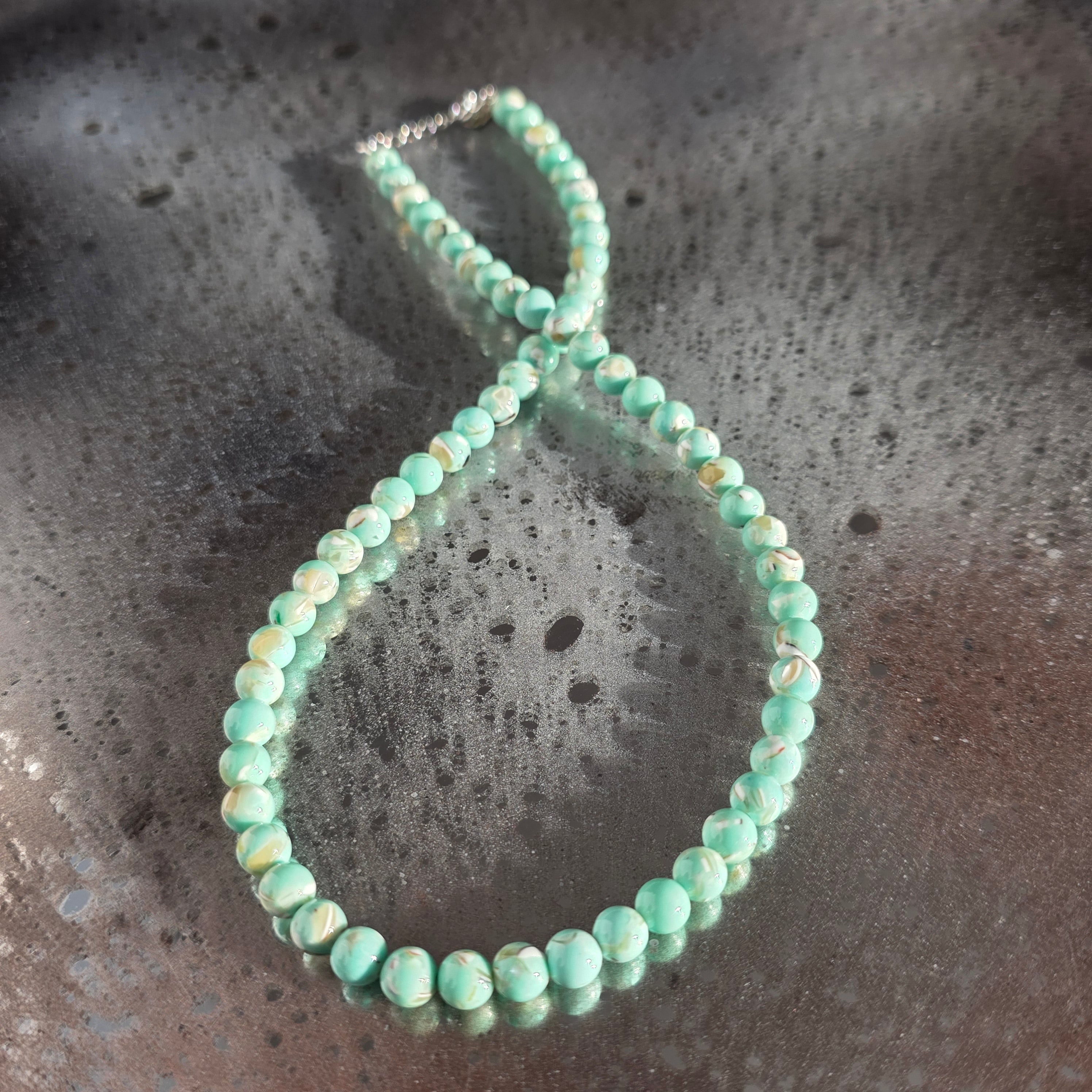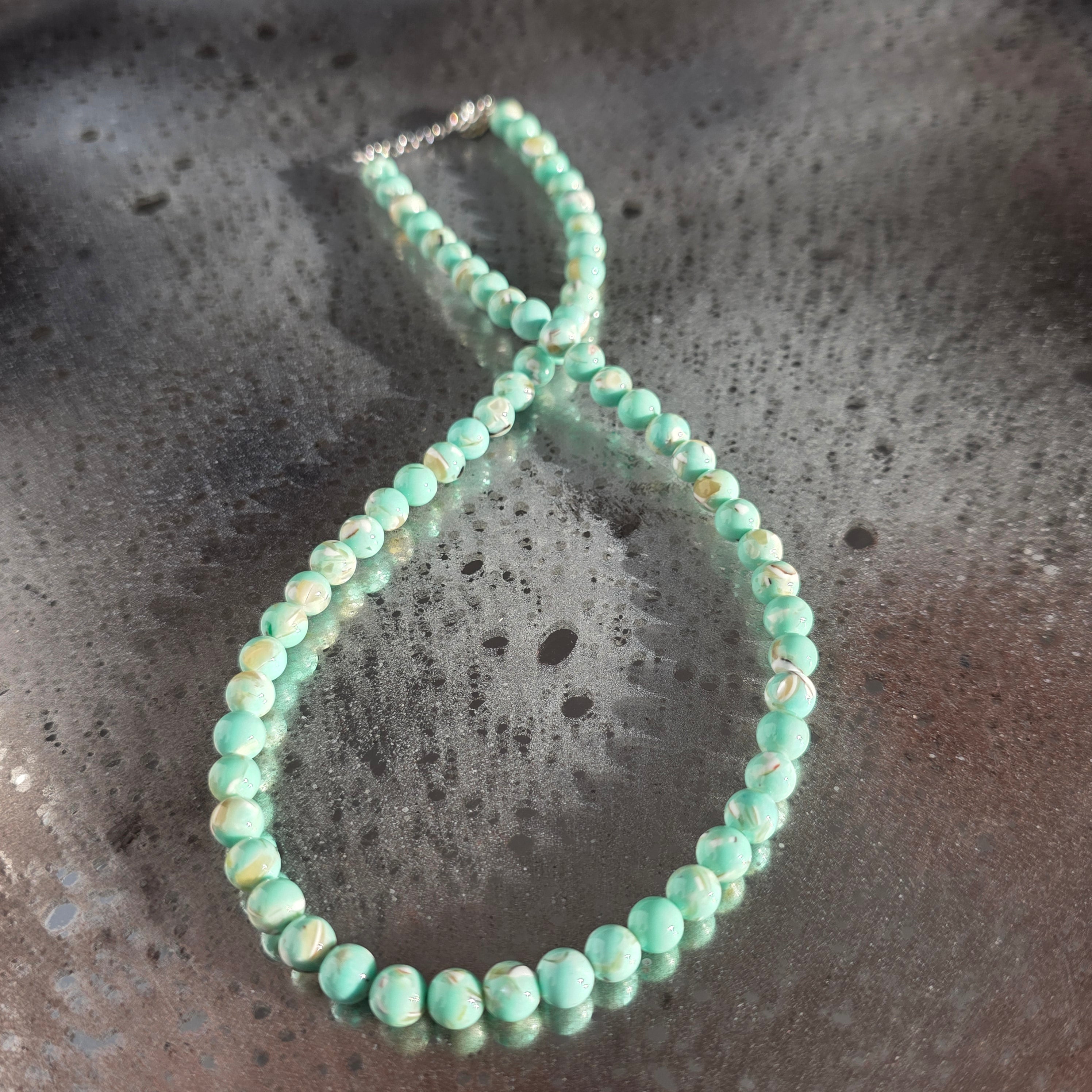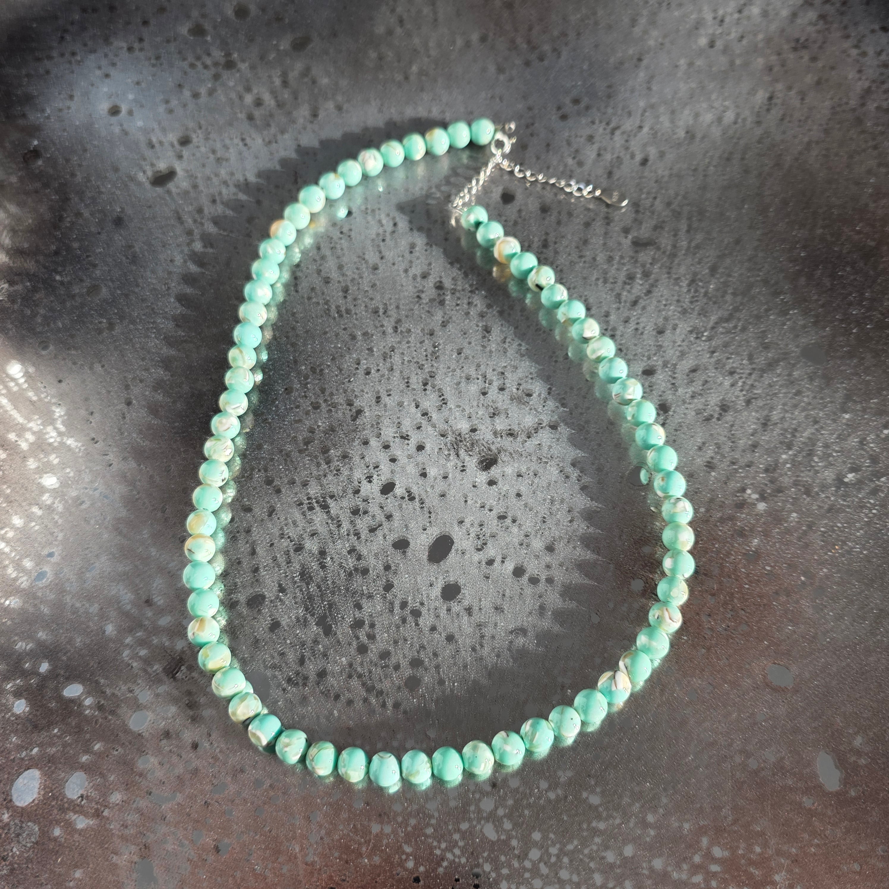Una collana delicata e armoniosa, realizzata con sfere di madreperla da 6 mm. La superficie liscia e le sfumature calde e perlata creano una presenza calma ed elegante, facile da integrare sia in outfit quotidiani sia in combinazioni più raffinate.