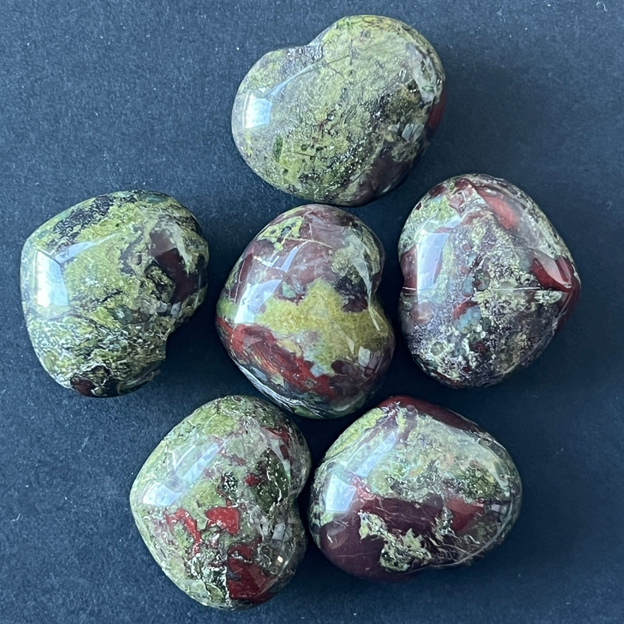 Il cuore di Diaspro Sangue di Drago è una pietra della forza e del coraggio ancestrale, nata dall'incontro degli elementi primordiali. Il suo verde profondo e le macchie rosse sembrano tratte da racconti antichi, in cui il sangue dei draghi dava vita alla Terra. Ogni cuore è un pezzo unico, con texture irripetibili, che porta in sé l'impronta dell'energia viva della natura.