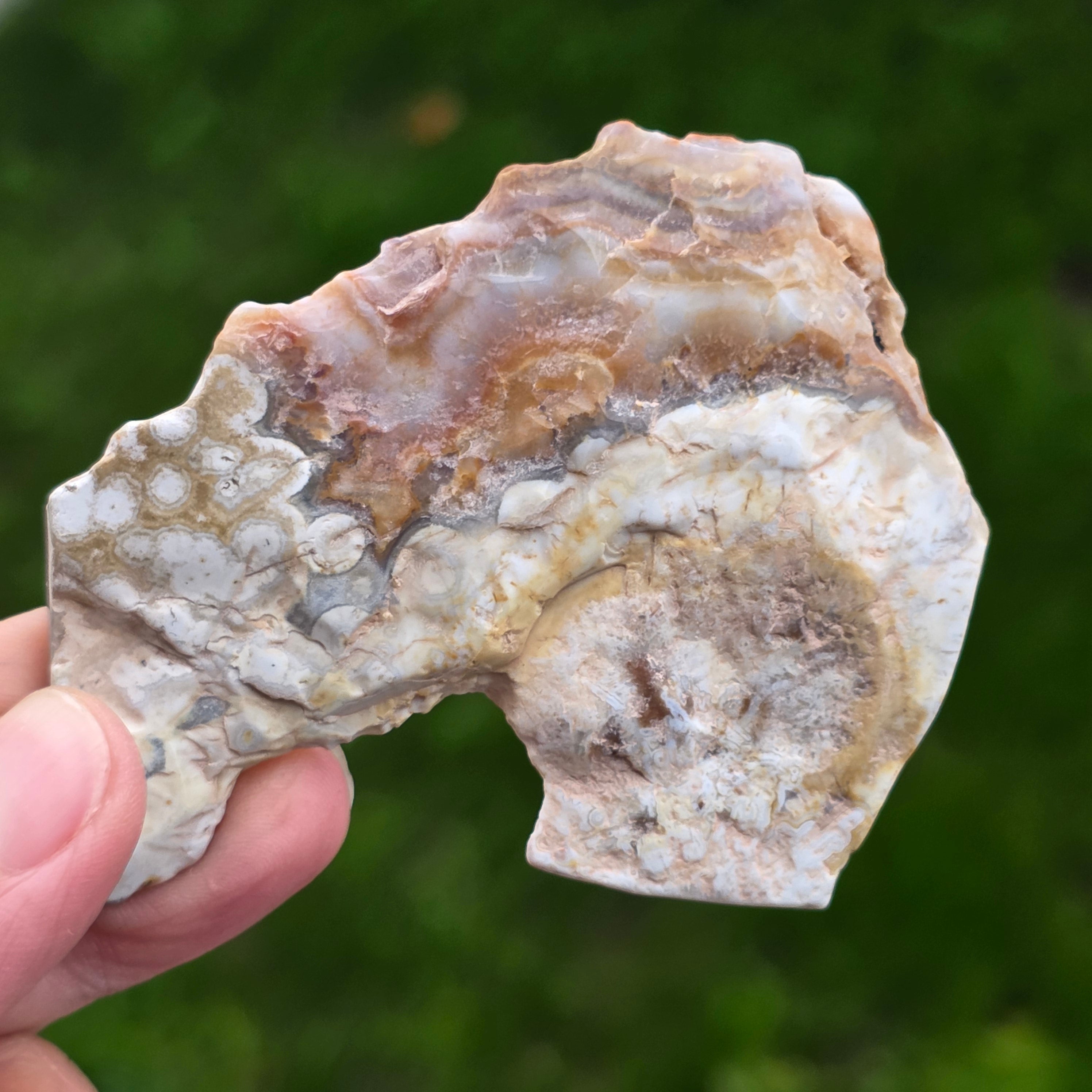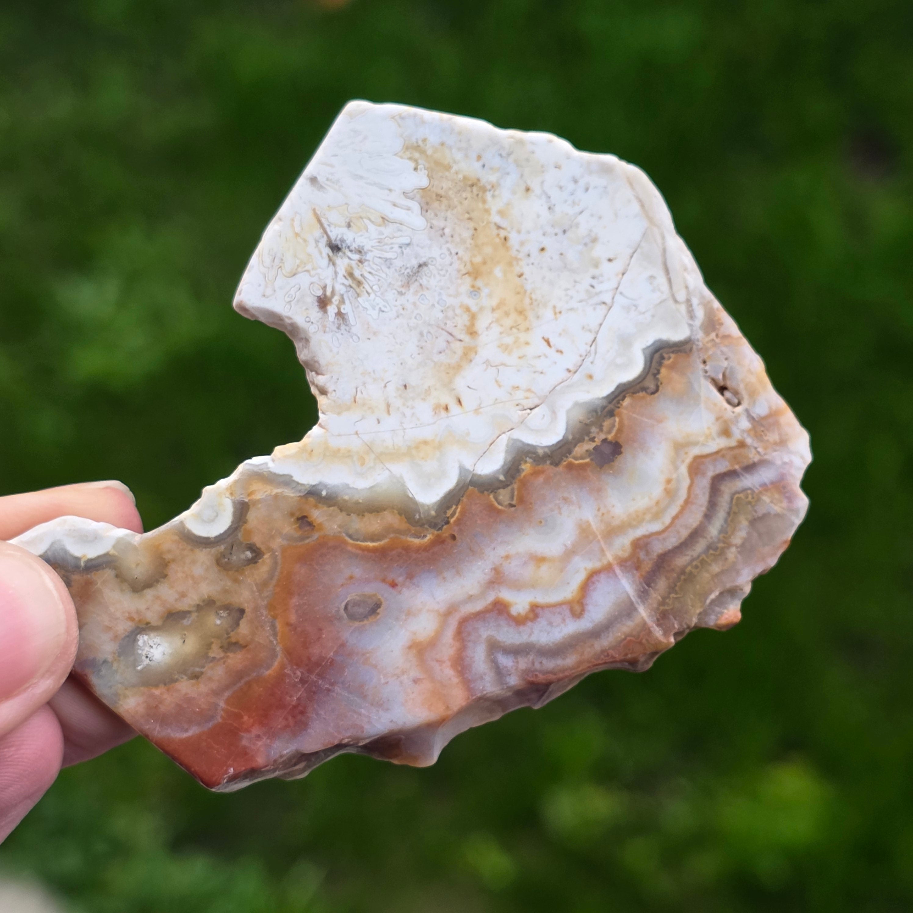 L'agata Crazy del Messico è una delle varietà di agata più vibranti e spettacolari, famosa per le sue linee ondulate e i giochi di colori folli che sembrano disegnati da una mano libera, senza regole. In questa fetta naturale, piccola ma estremamente espressiva, si rivela l'intera storia della pietra: strati terrosi, tonalità calde di caramello, rosso acceso, arancione, grigio e crema, mescolati in motivi a spirale che sembrano pulsare di vita.