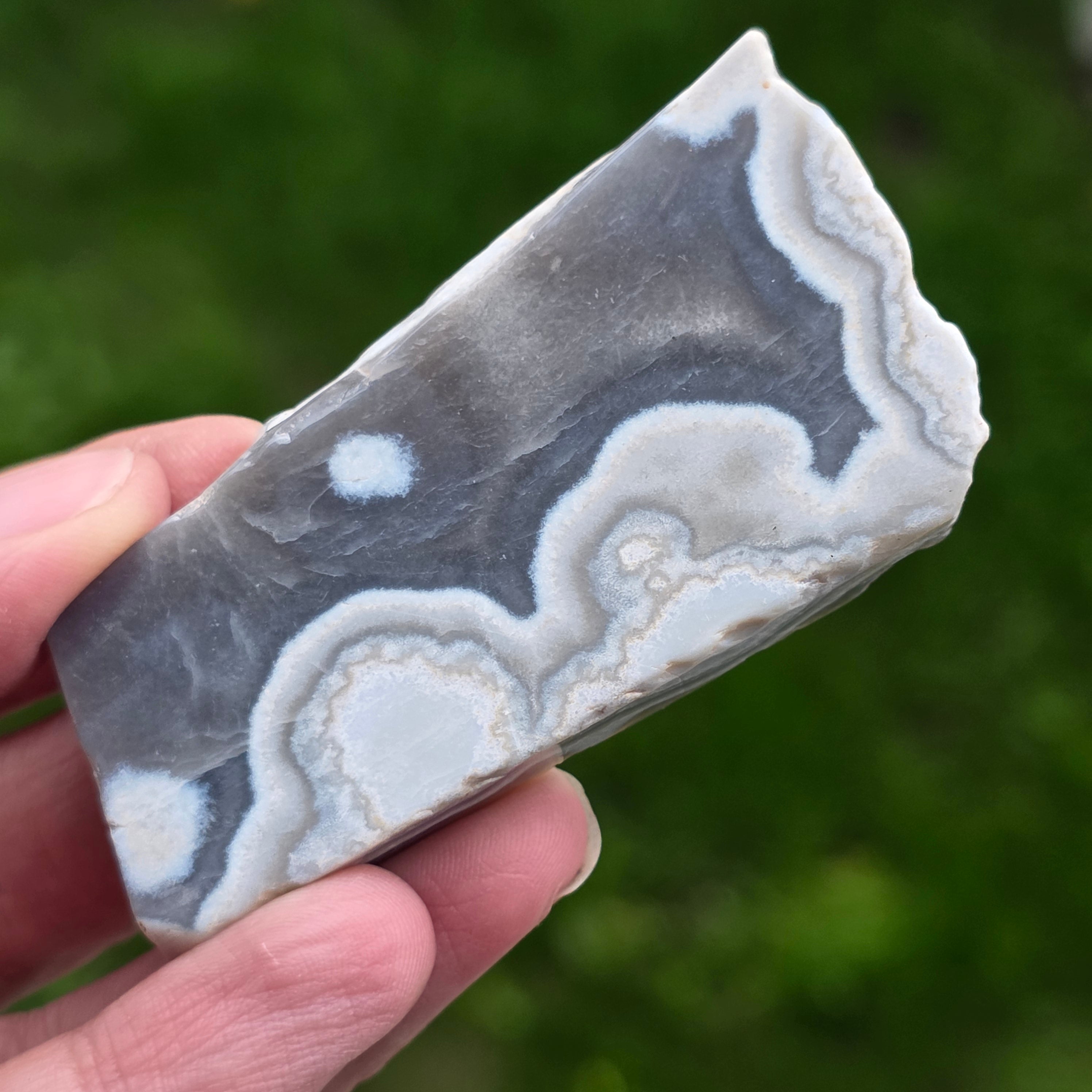 Ogni fetta di agata crazy è un’opera d’arte unica, e questa cattura l’essenza selvaggia delle regioni messicane in cui si forma: forte contrasto, texture organiche e un’energia allegra, giocosa, con lo scopo di rivitalizzare l’interiorità.