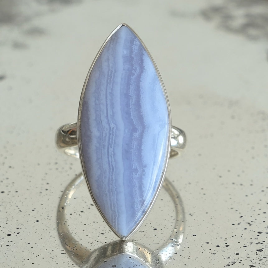 Descoperă colecția noastră de bijuterii cu calcedonie Blue Lace, unde fiecare piatră spune o poveste despre calm, claritate și frumusețea interioară care radiază tăcut.