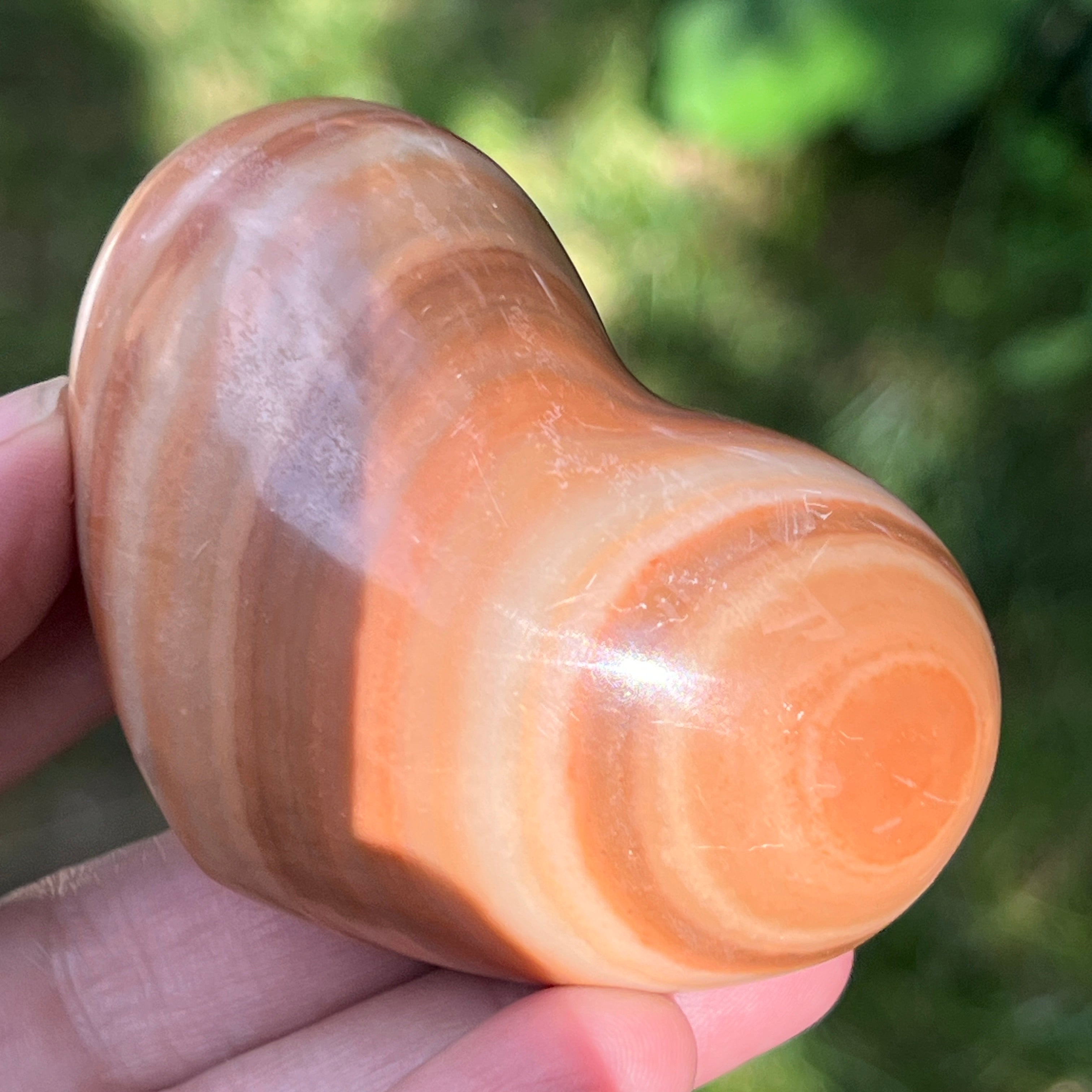 O sferă caldă ca apusul într-un deșert antic, această piatră fascinantă îmbină onixul portocaliu cu vene delicate de calcit, în straturi care par pictate de timp. Nuanțele vibrante de portocaliu, miere și chihlimbar pulsează cu energia vieții și aduc o notă de vitalitate oricărui spațiu. Este o piesă care trezește simțurile și inspiră creativitatea, dar păstrează în același timp un echilibru profund, ancorat în energia pământului.