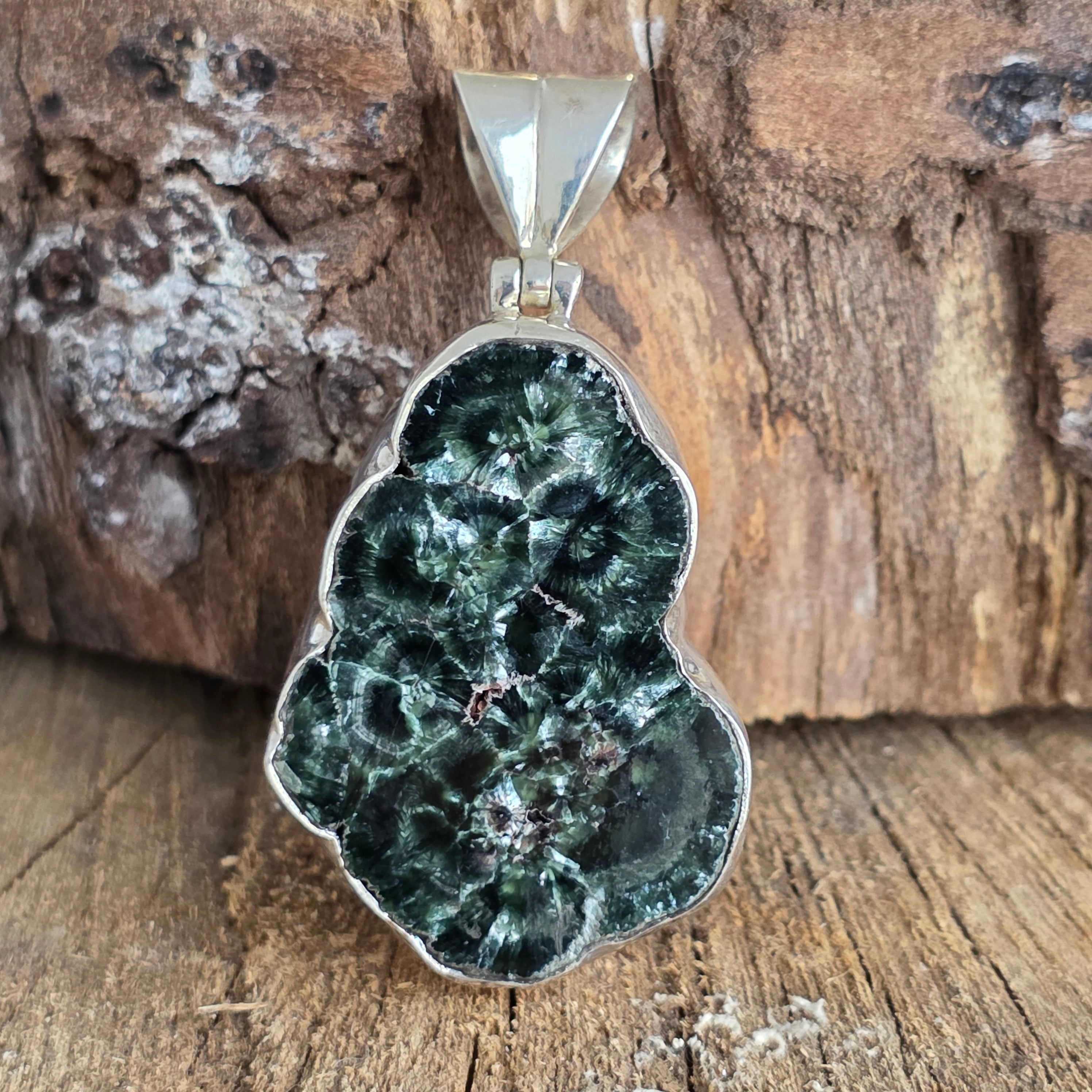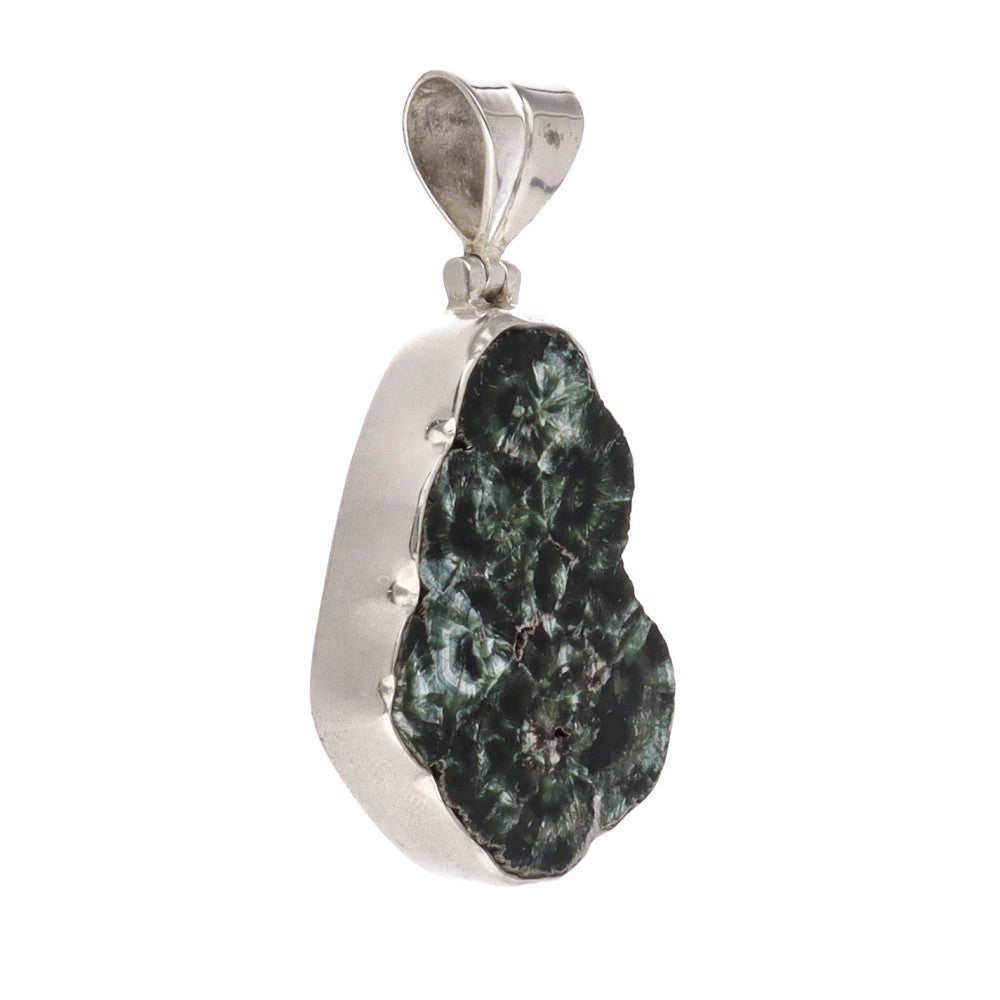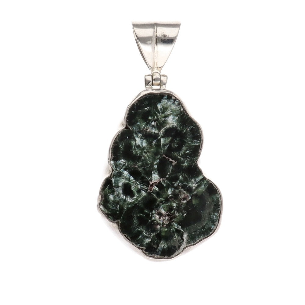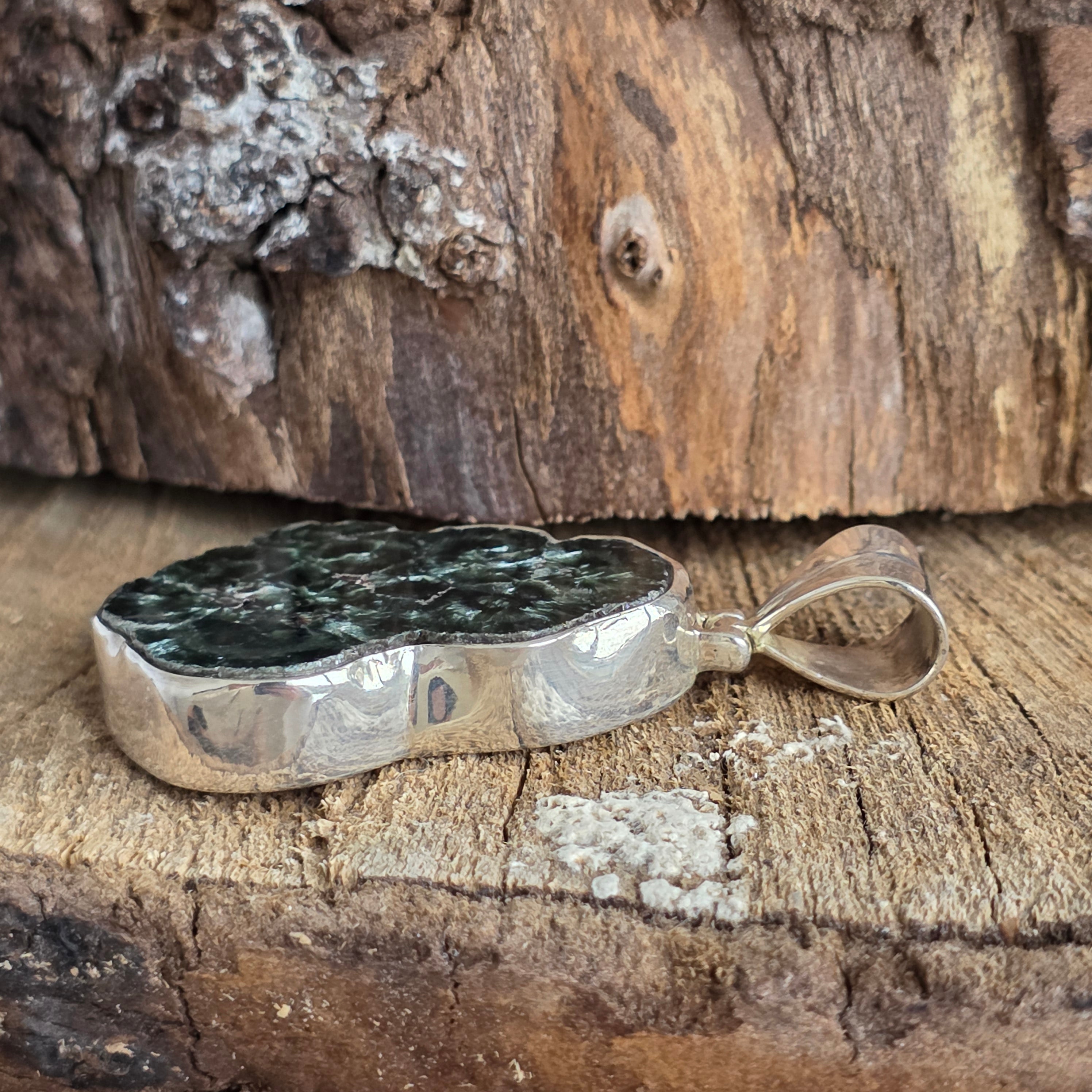 Acest pandantiv cu serafinit natural în argint 925 este o bijuterie unică, ce reflectă frumusețea angelică a acestei pietre rare. Nuanțele sale verzi adânci, străbătute de reflexe argintii asemănătoare cu penele delicate ale aripilor, îl fac un cristal cu adevărat aparte.