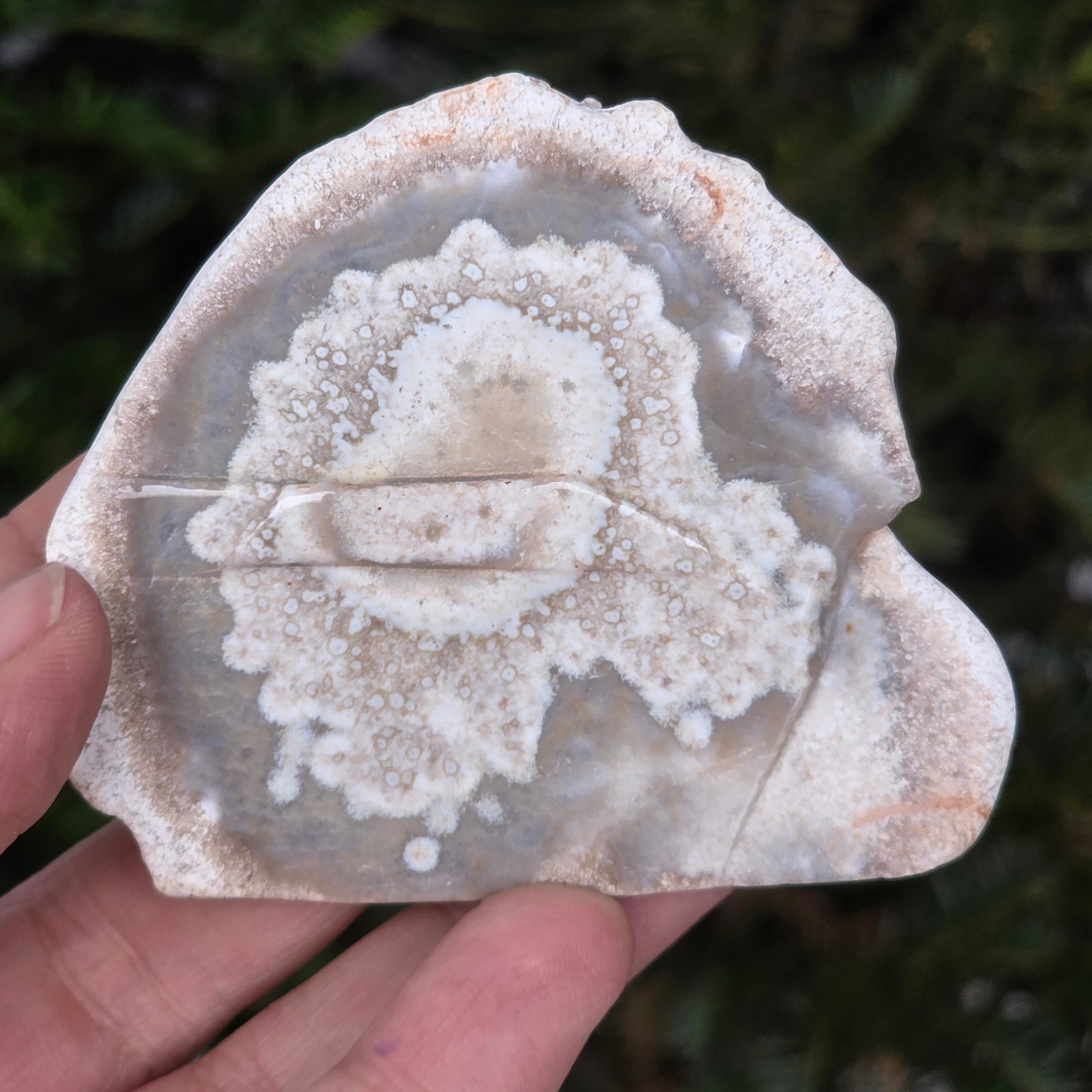 L'agata Crazy del Messico è una delle varietà di agata più vibranti e spettacolari, famosa per le sue linee ondulate e per i giochi di colori folli che sembrano disegnati da una mano libera, senza regole. In questa fetta naturale, piccola ma estremamente espressiva, si rivela l'intera storia della pietra: strati terrosi, tonalità calde di caramello, rosso intenso, arancione, grigio e crema, mescolati in motivi a spirale che sembrano pulsare di vita.