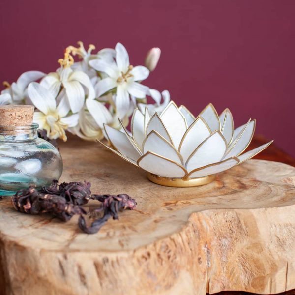 Porta candela bianco chiaro a forma di fiore di loto dalle Filippine con conchiglie Capiz