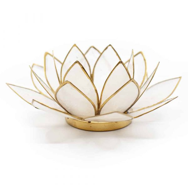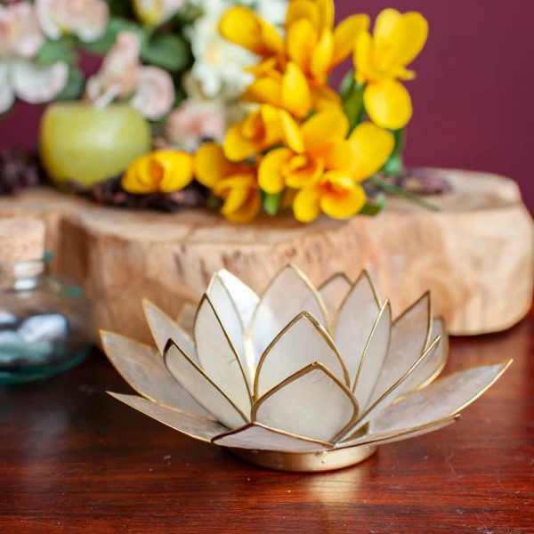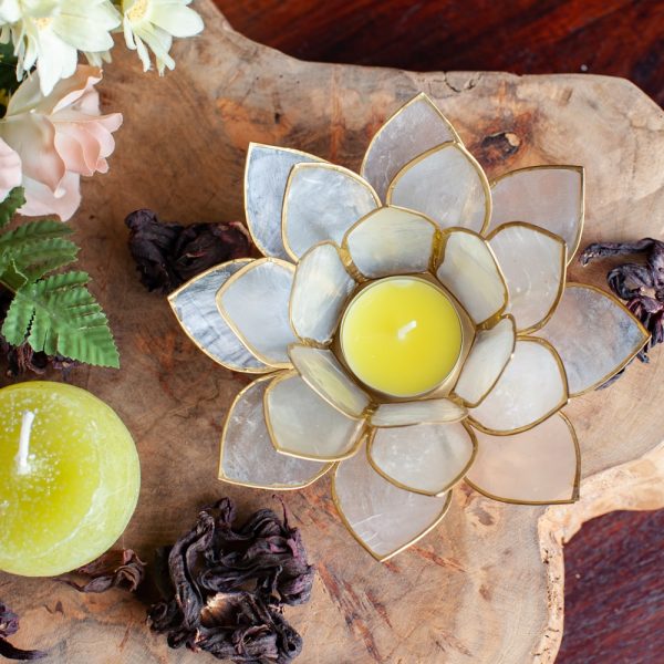 Portacandela bianco naturale fiore di loto dalle Filippine con conchiglie Capiz