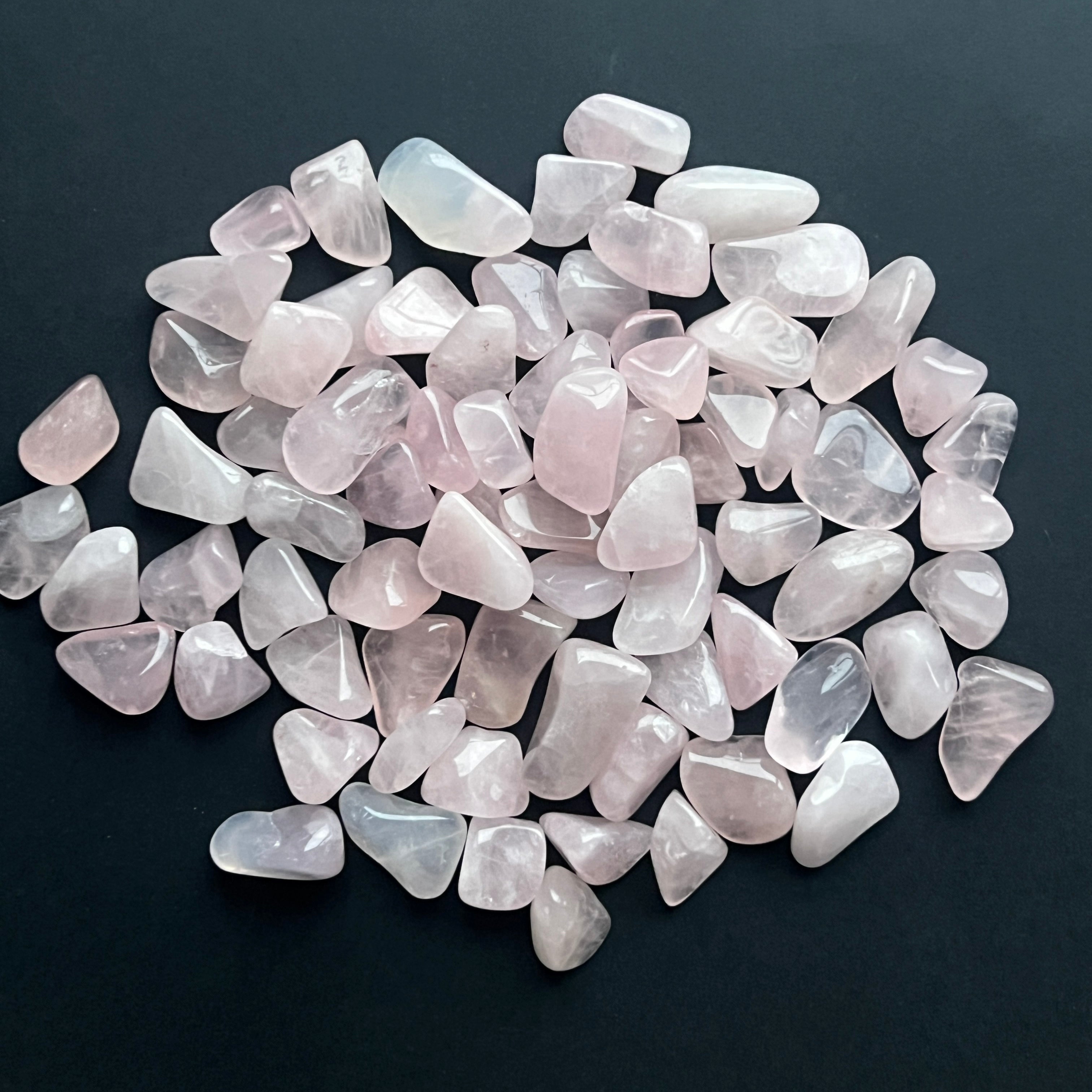 Le pietre di 12–15 mm sono più voluminose rispetto ai chips piccoli abituali, ideali per progetti che richiedono una forte presenza visiva. Ogni pezzo è leggermente levigato, ma conserva la forma irregolare, organica, tipica del quarzo grezzo trasformato in chips. La miscela visiva è armoniosa – un bouquet di rosa delicati, calmanti ed eleganti.