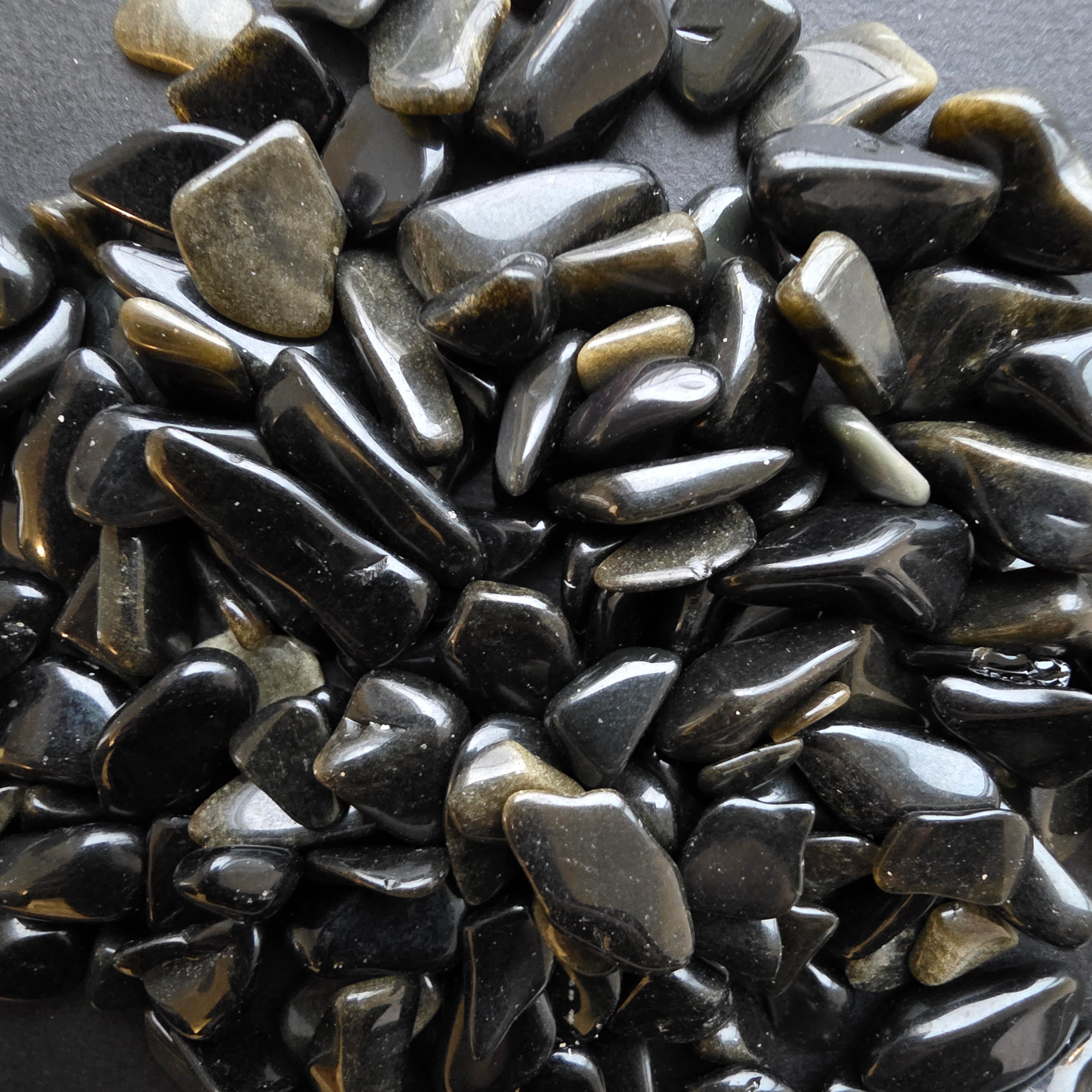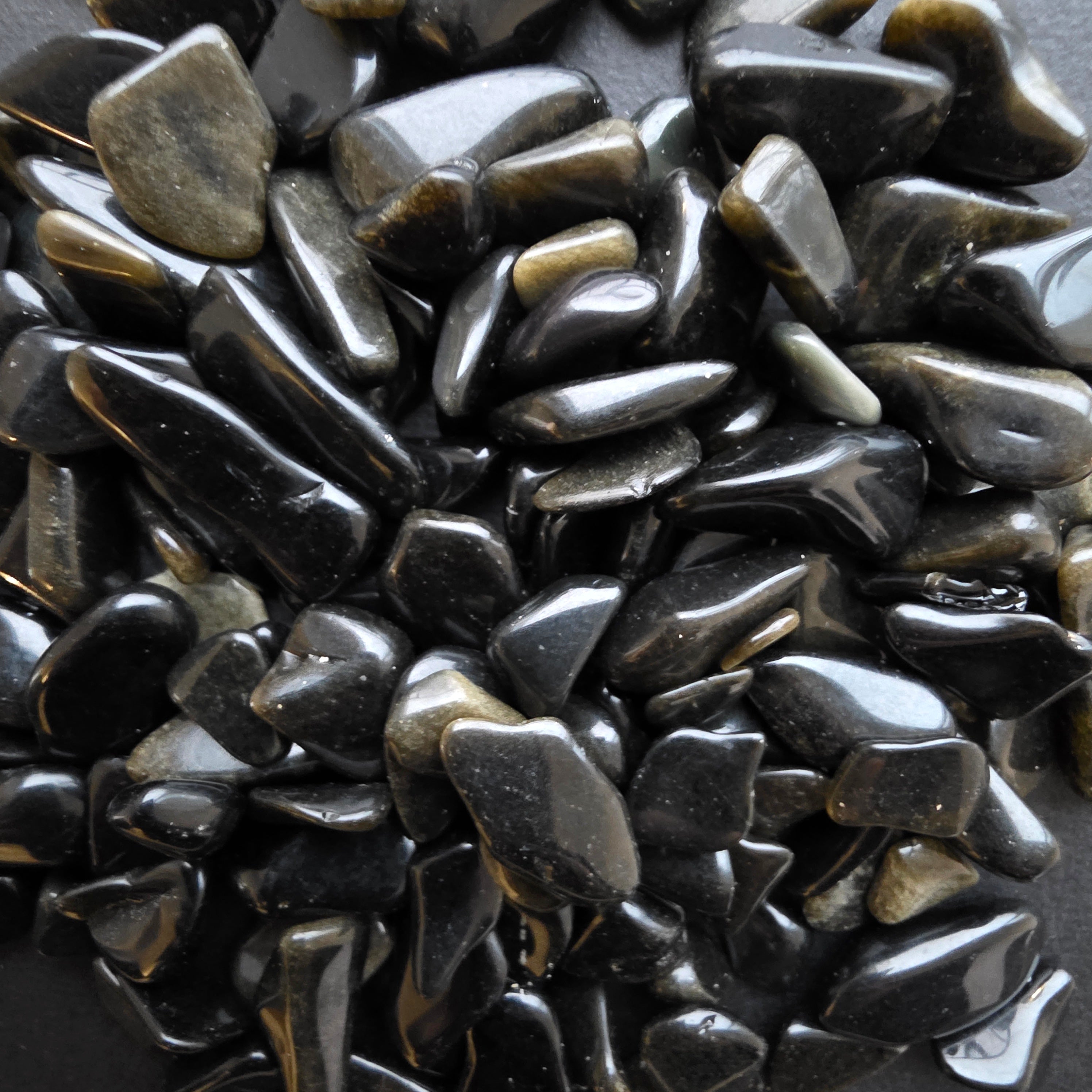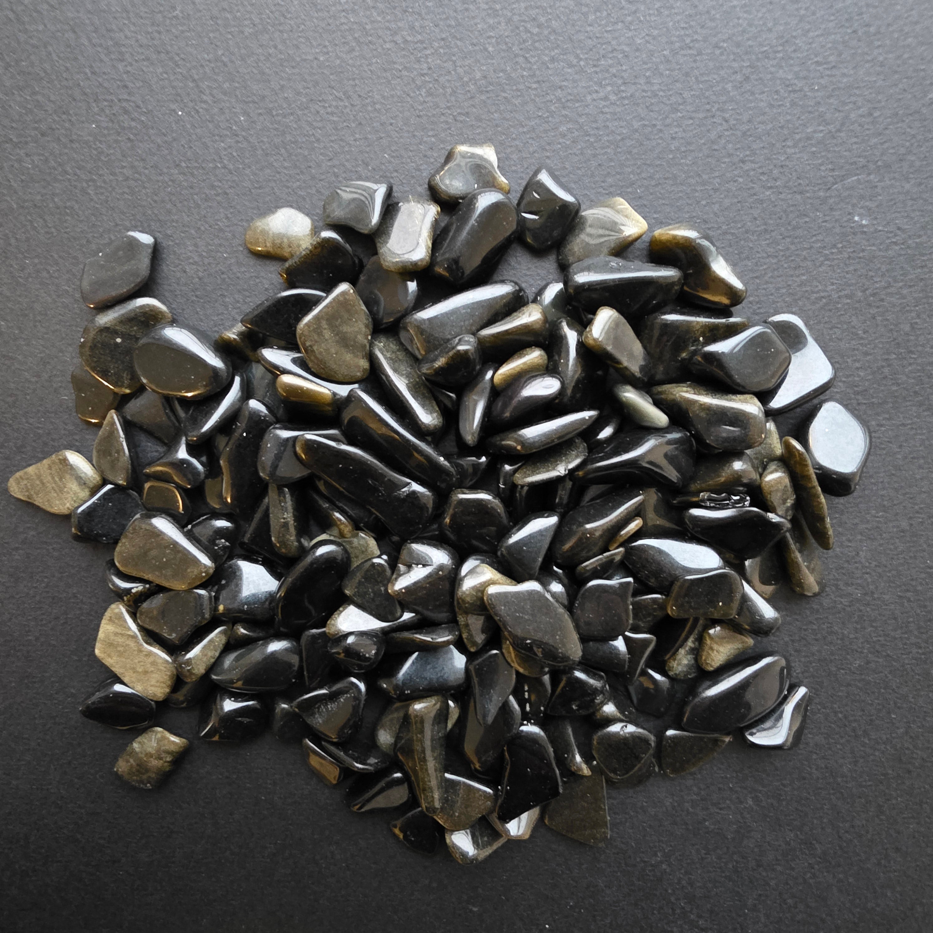 Le scaglie di 8–12 mm sono irregolari, levigate solo quanto basta per ottenere una texture liscia, senza perdere il carattere naturale. Alcuni pezzi sono completamente opachi e neri, altri presentano discrete trasparenze verso i bordi, e alcuni sorprendono con la loro intensa lucentezza, come un frammento di notte solidificata.