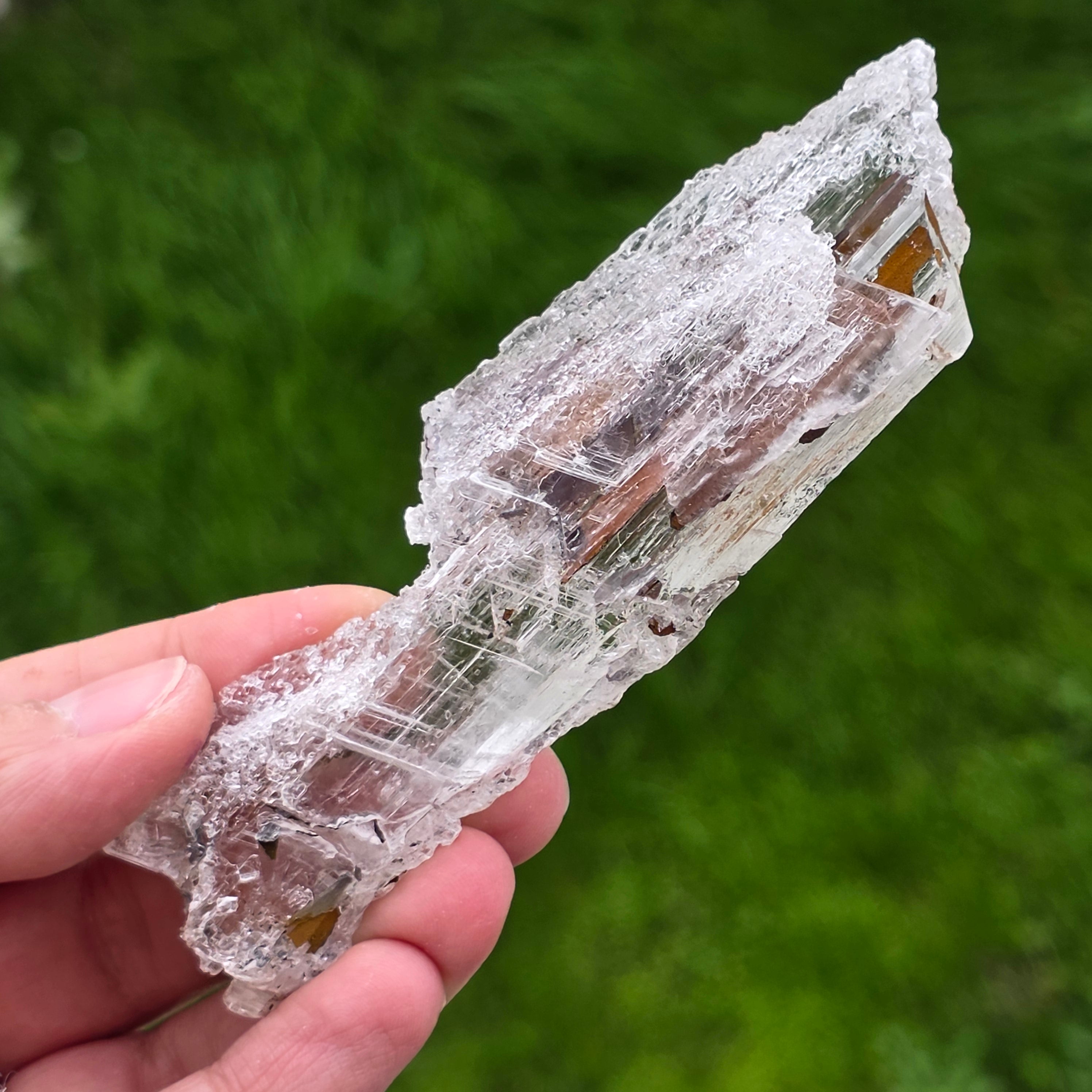 Questo campione di selenite con ematite dal Messico è un pezzo mineralogico autentico, apprezzato per il contrasto naturale tra la trasparenza lattiginosa della selenite e le tonalità metalliche, bruno-rossastre dell’ematite. L’associazione tra questi due minerali crea un aspetto visivo intenso.