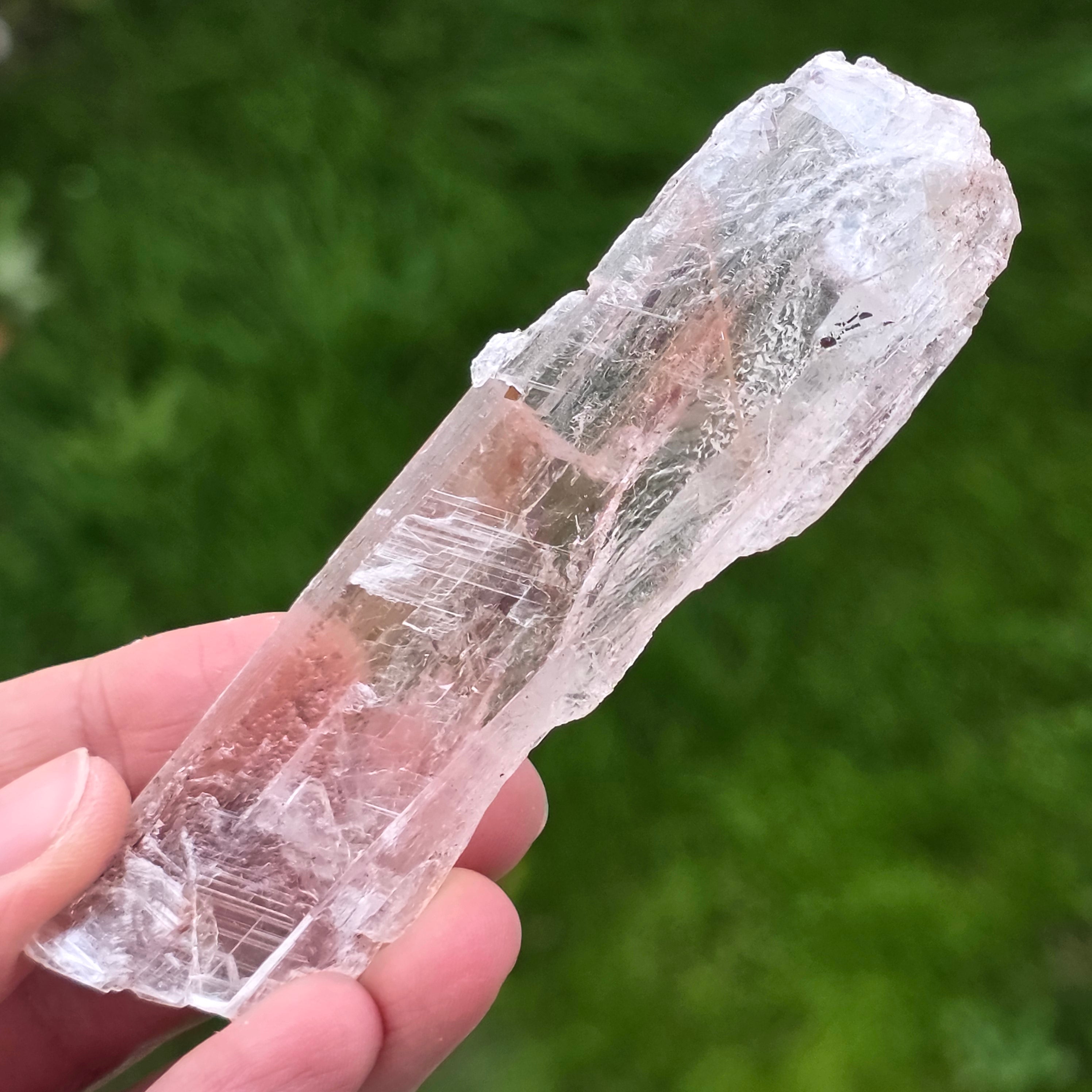 La selenite si presenta sotto forma di cristalli allungati o lastre traslucide, con lucentezza setosa e trama fine, mentre l’ematite è presente sotto forma di inclusioni, pellicole o depositi naturali, che accentuano la struttura del cristallo e gli conferiscono profondità visiva.