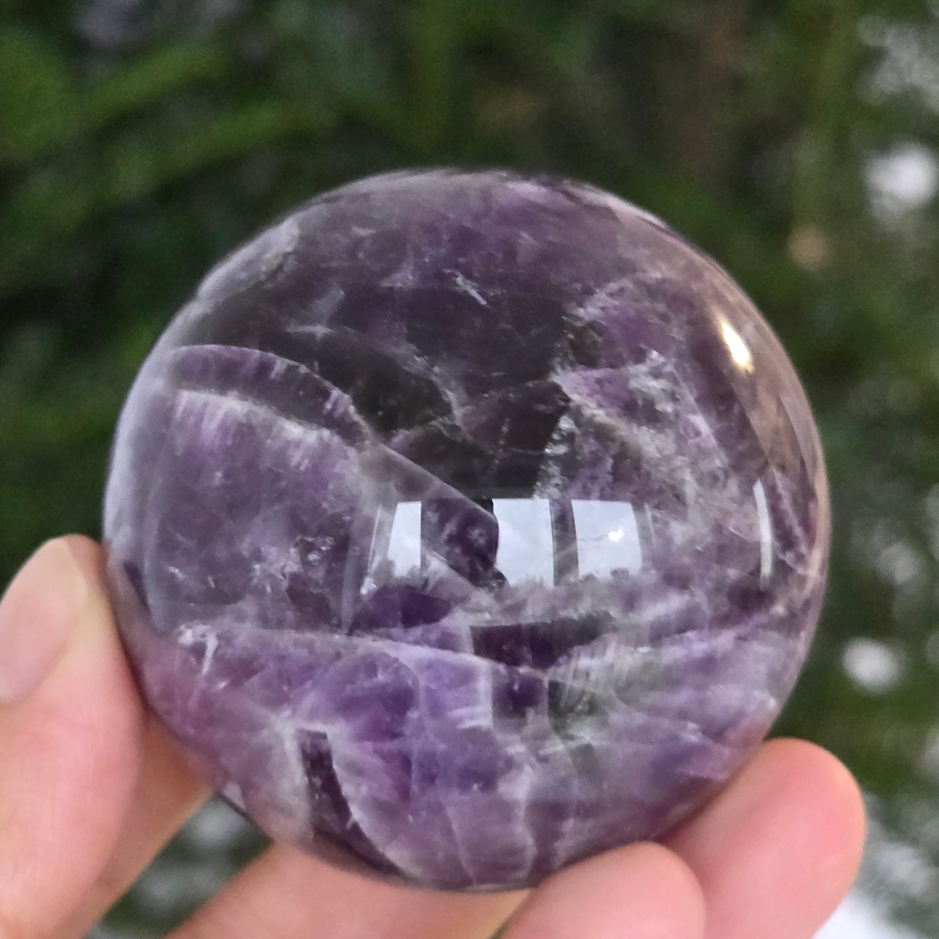 Una sfera che sembra concentrare al suo interno la luce di una notte lilla. Questo pezzo unico di ametista chevron naturale, rivela strati sorprendenti di viola, bianco e lavanda, disposti a forma di V – il segno distintivo di questa rara varietà di ametista. La superficie perfettamente levigata, vellutata al tatto, riflette la luce con una finezza ipnotica, portando calma e raffinatezza in ogni spazio.