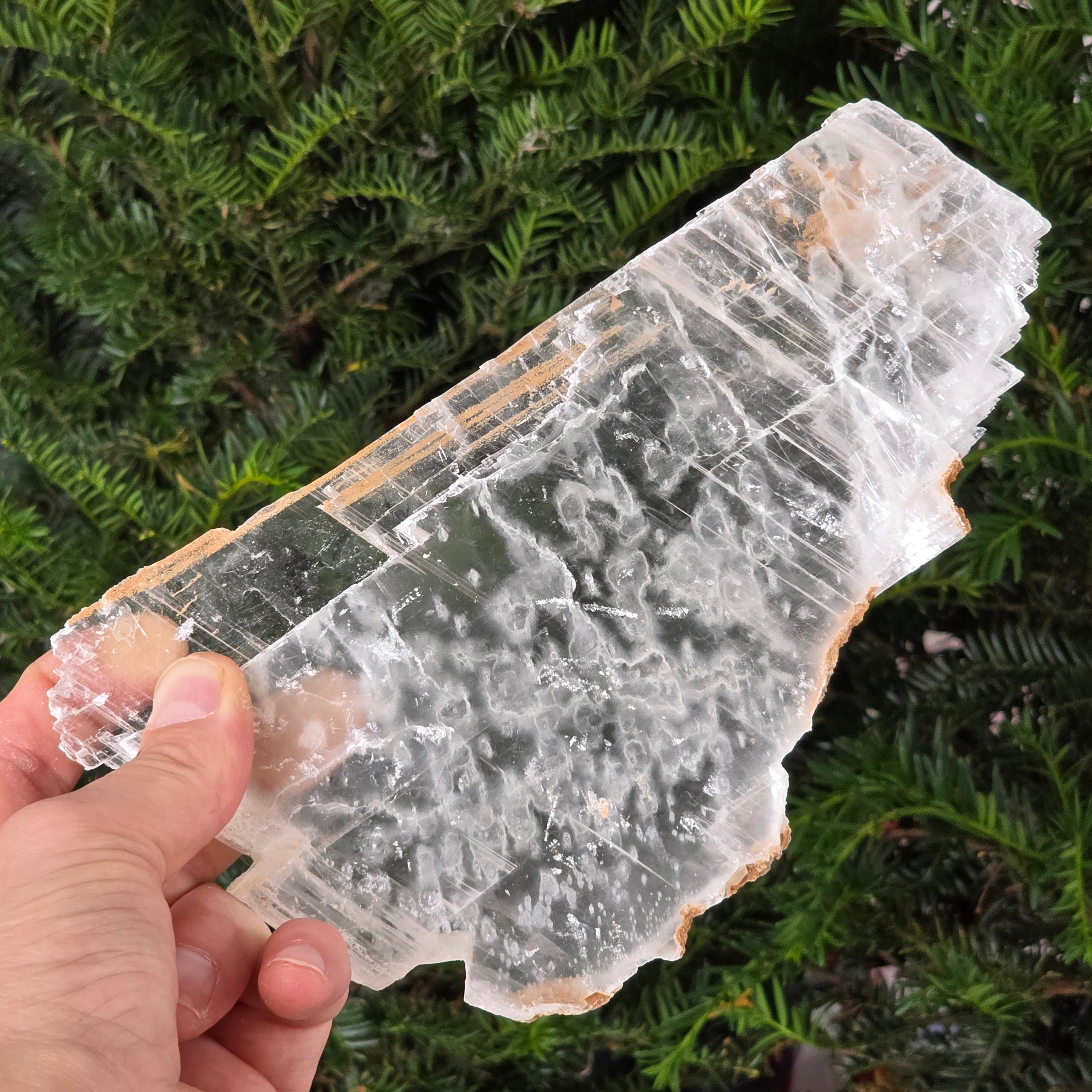 Questa pietra grezza di selenite vetrosa sembra un frammento di luce solidificata. I suoi strati traslucidi e i riflessi diafani catturano la luce in una danza sottile, portando una sensazione di purezza e pace.